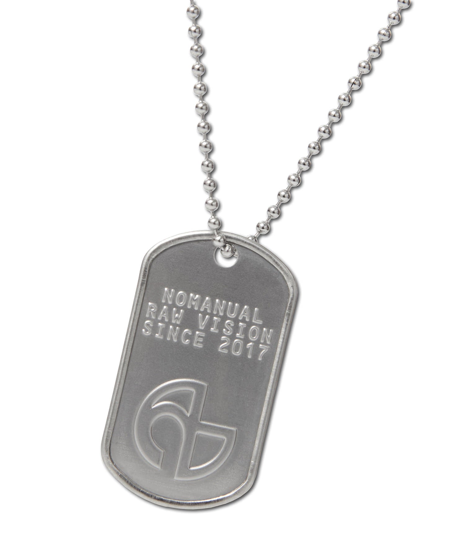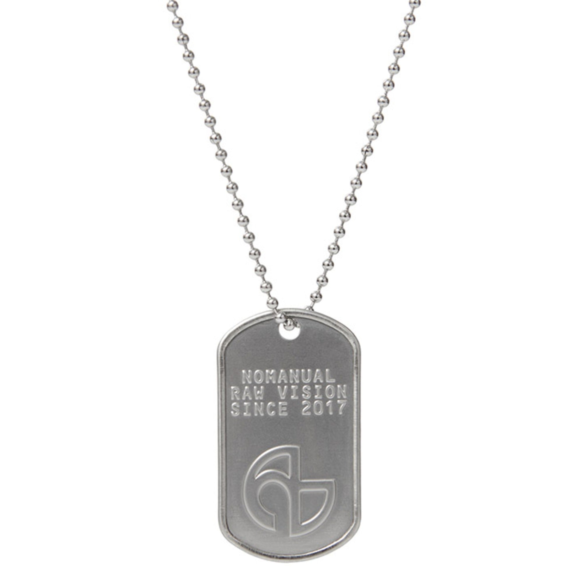 Le pendentif rectangulaire est gravé du nom de la marque NOMANUAL, du slogan RAW VISION SINCE 2017 et du logo.