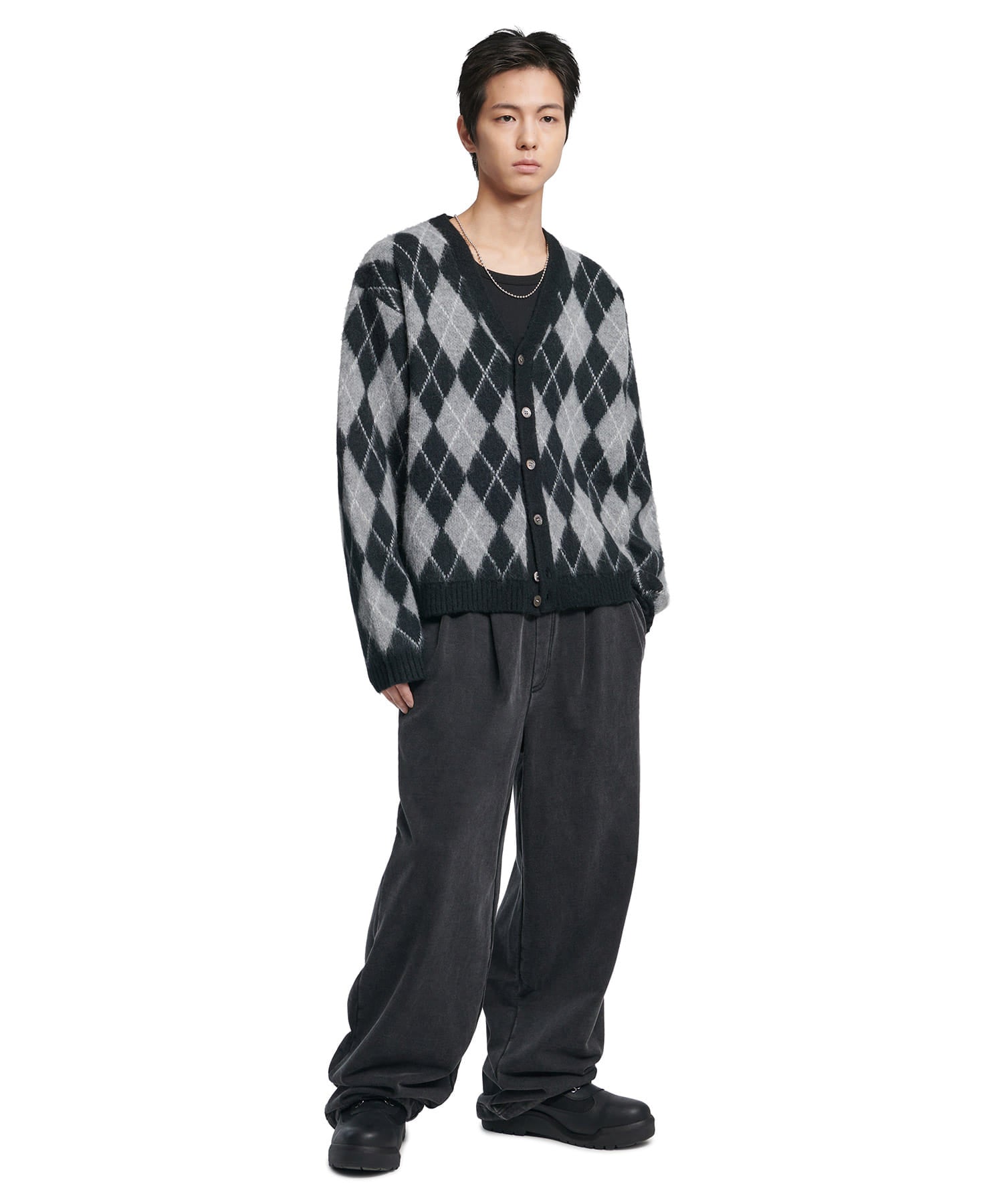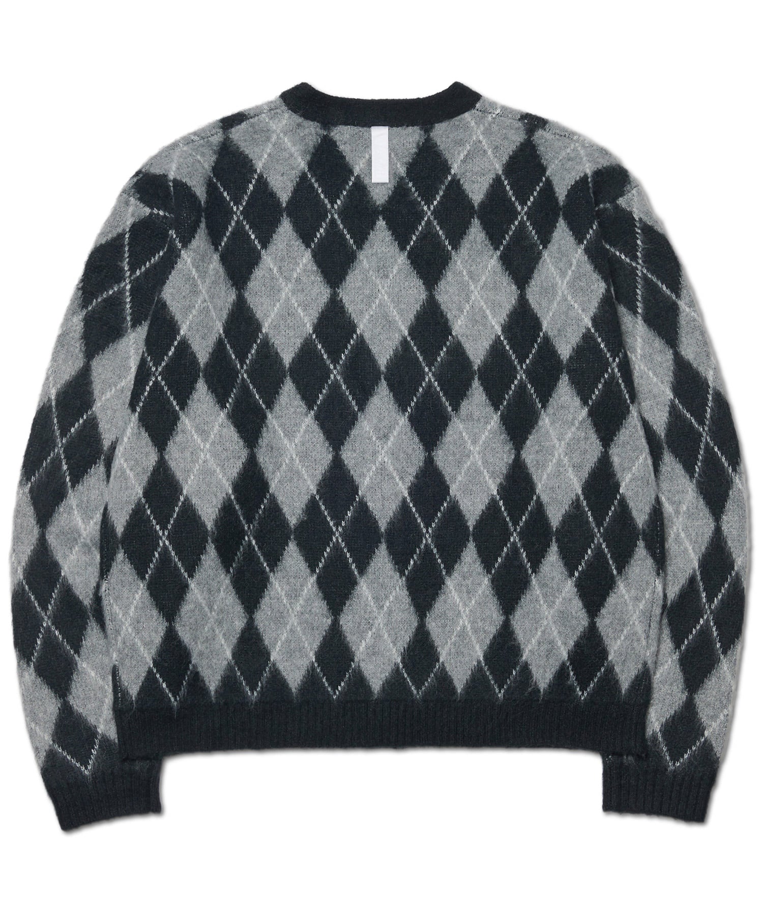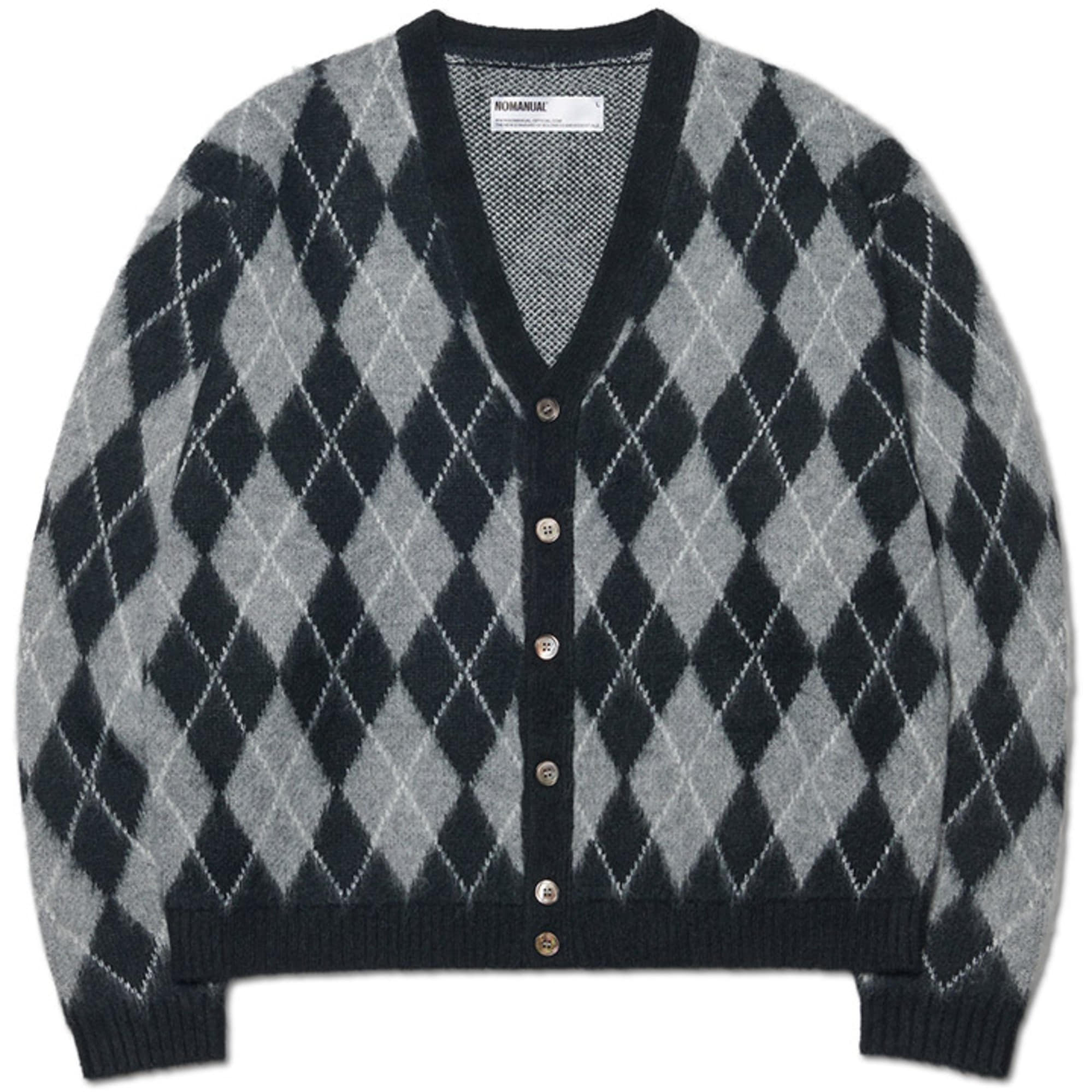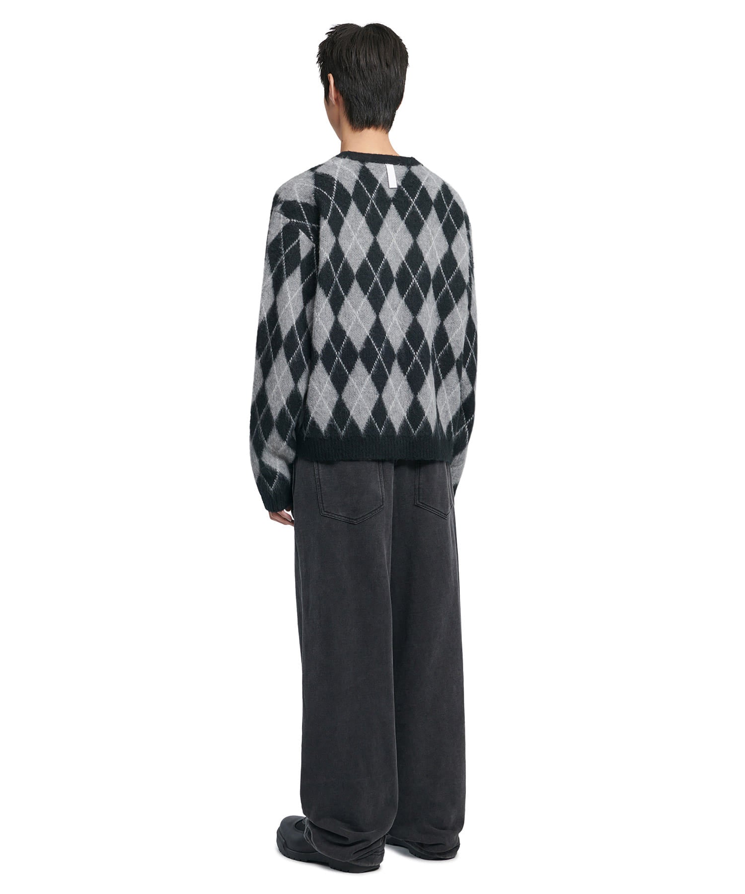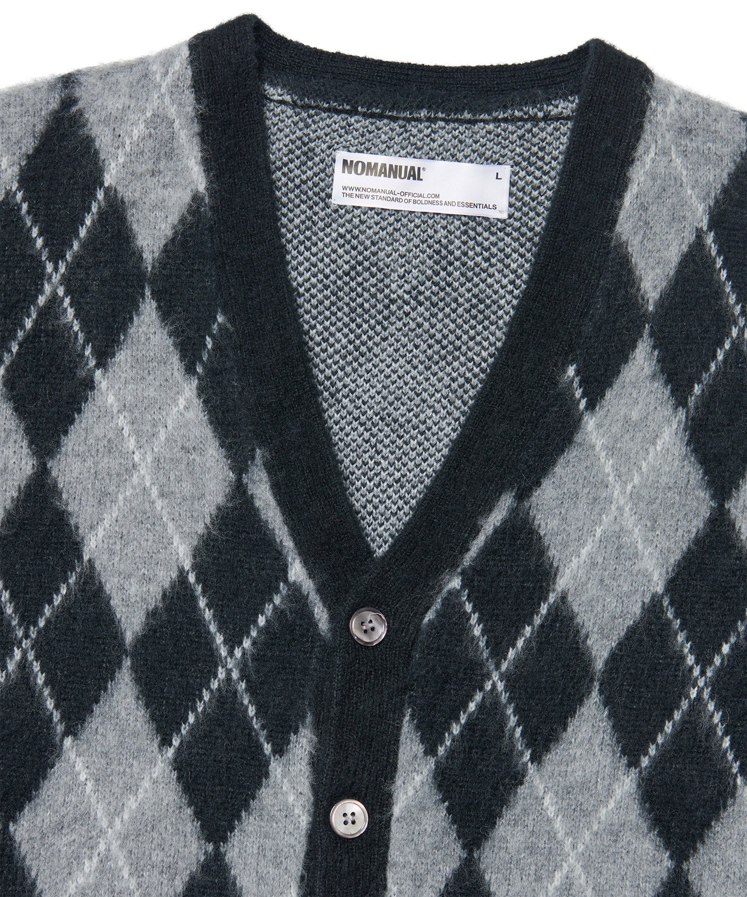 Cardigan doux, chaud et légèrement poilu, avec un motif argyle classique gris et noir, et un col V plongeant qui apporte une touche élégante et décontractée. Des boutons nacrés sur toute la longueur, avec les deux derniers rapprochés pour une touche subtile et raffinée. La coupe est confortable et ample, parfaite pour superposer sur d’autres pièces.