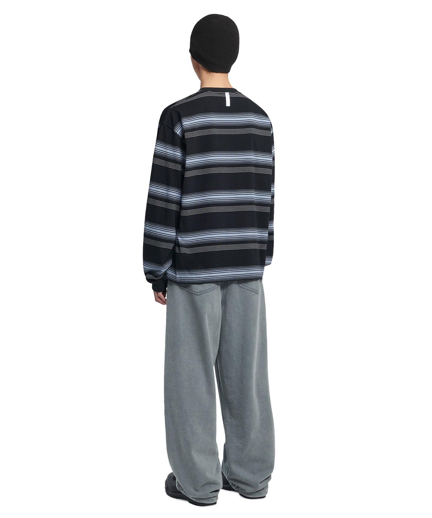T-shirt manches longues noir en coton doux, avec des rayures alternées et dégradées blanches et bleues, pour un style graphique, moderne et en même temps subtilement rétro.