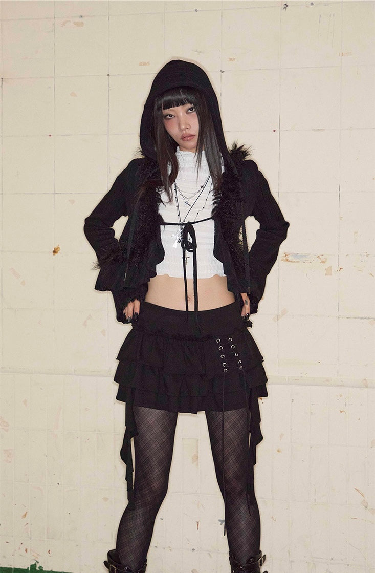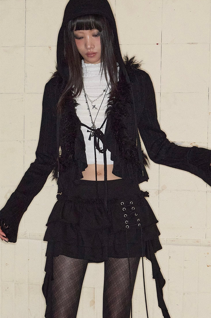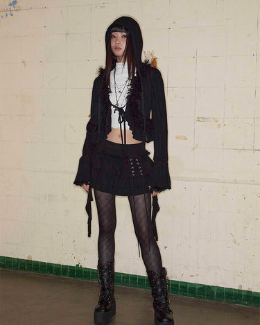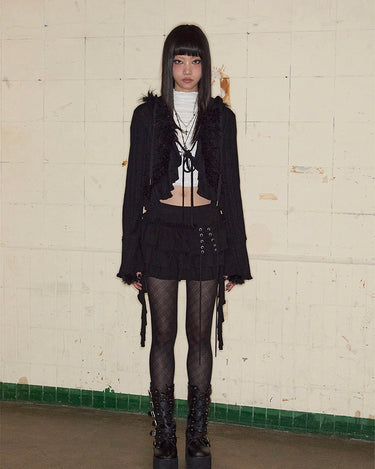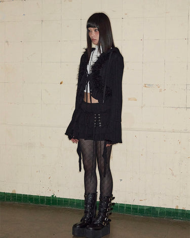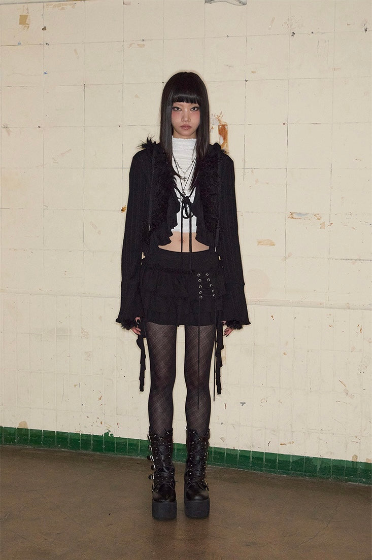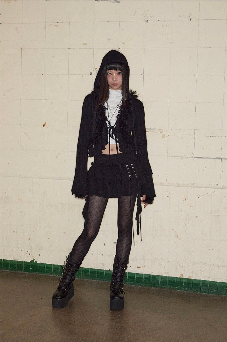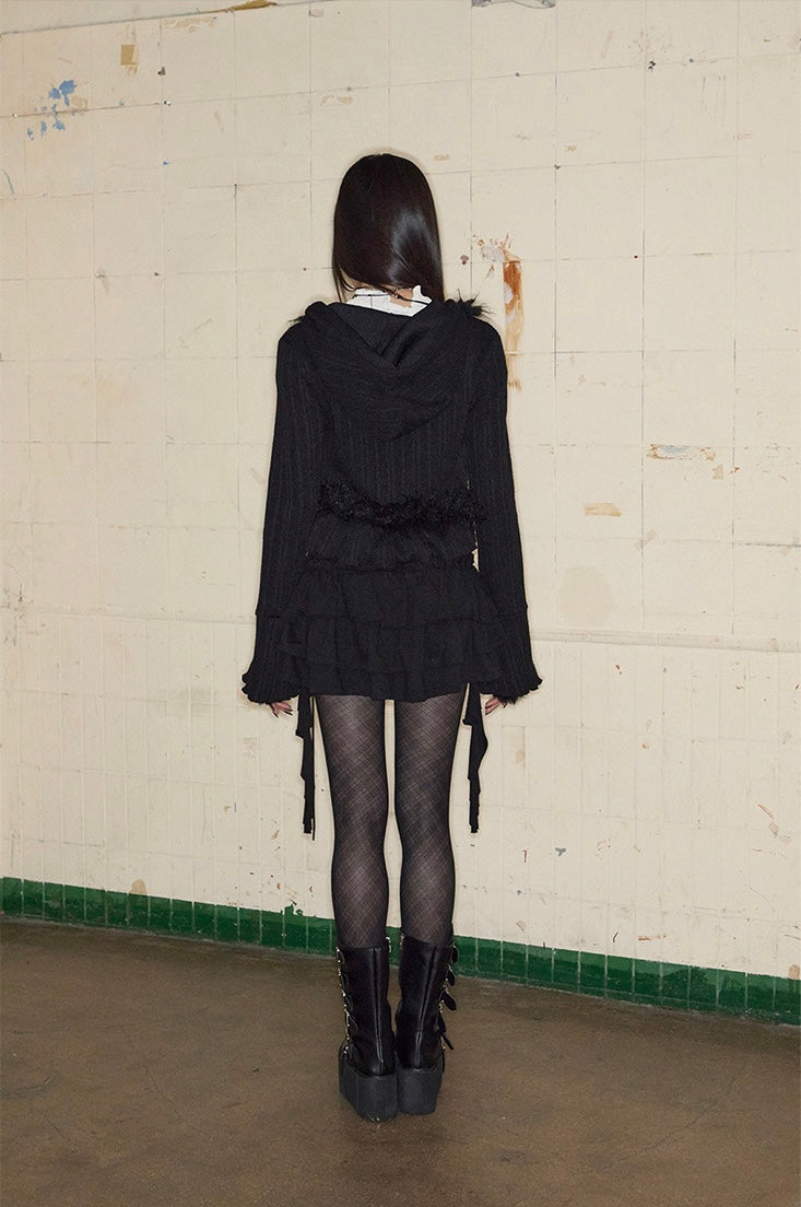 Confectionné dans une maille texturée, ce cardigan à capuche se distingue par sa finition en fausse fourrure duveteuse au style grunge, appliquée du devant jusqu’à l’arrière le long de la ligne de volants. Il se ferme à l’avant à l’aide d’un lien à nouer, tandis que la ligne incurvée du bas est soulignée de larges volants. Les manches se terminent par de larges poignets évasés.