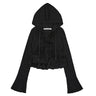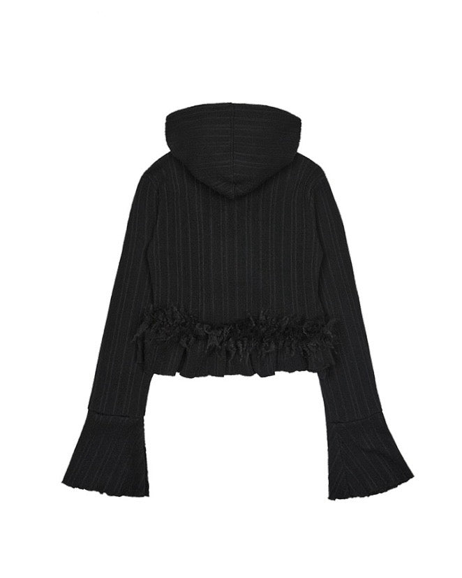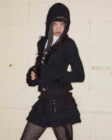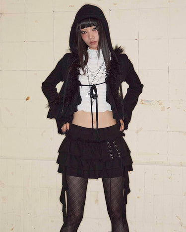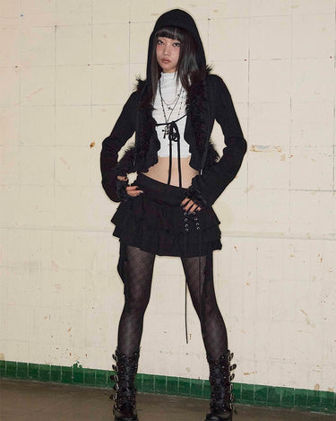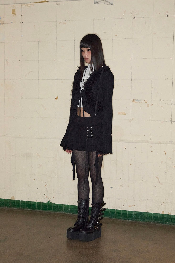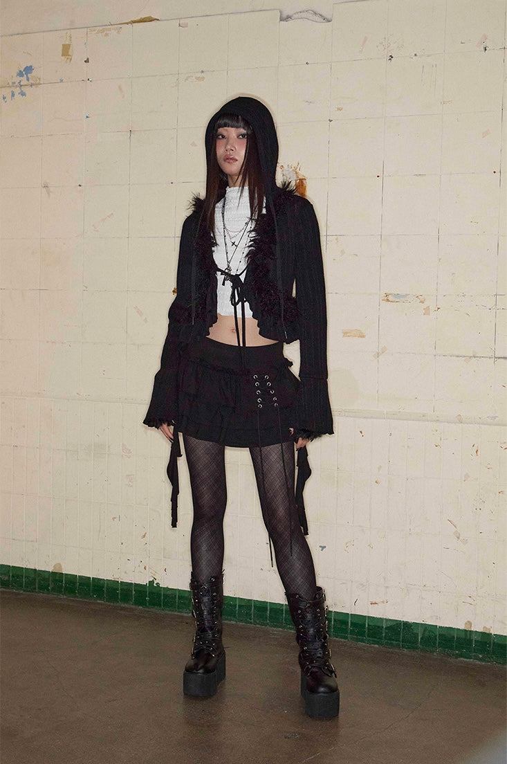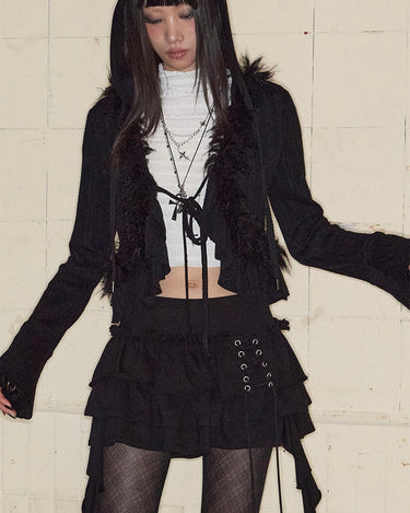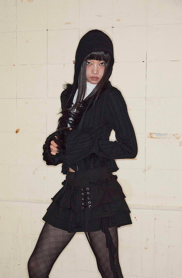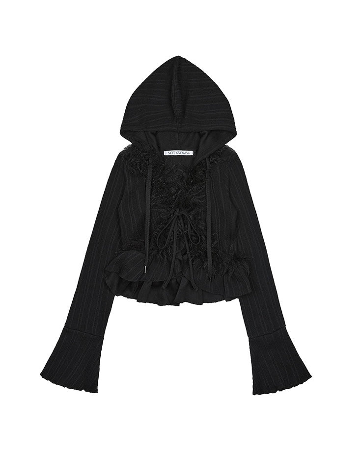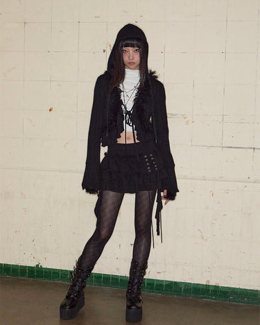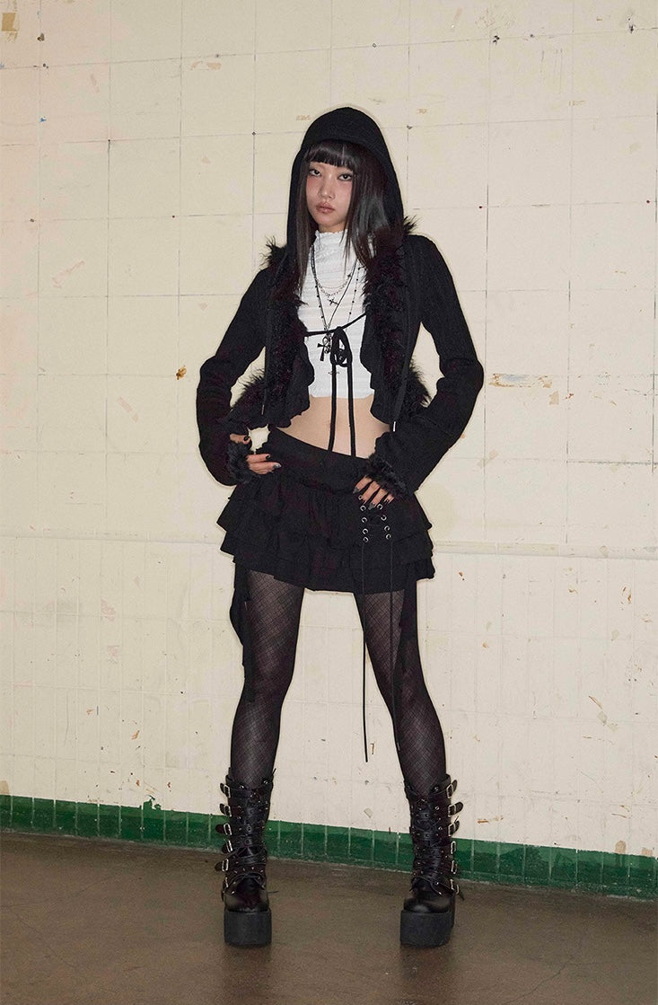 Confectionné dans une maille texturée, ce cardigan à capuche se distingue par sa finition en fausse fourrure duveteuse au style grunge, appliquée du devant jusqu’à l’arrière le long de la ligne de volants. Il se ferme à l’avant à l’aide d’un lien à nouer, tandis que la ligne incurvée du bas est soulignée de larges volants. Les manches se terminent par de larges poignets évasés.