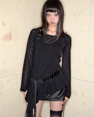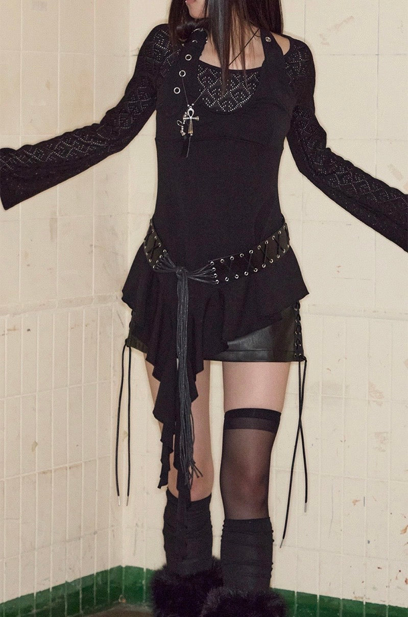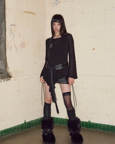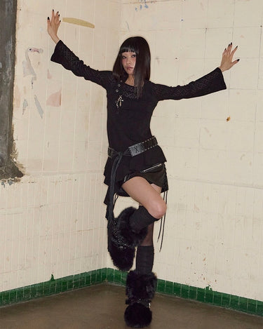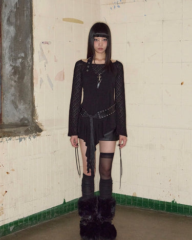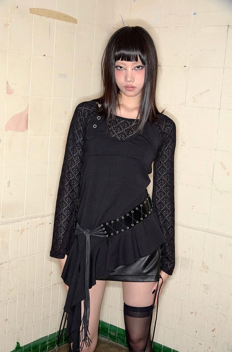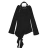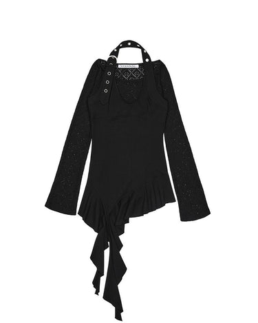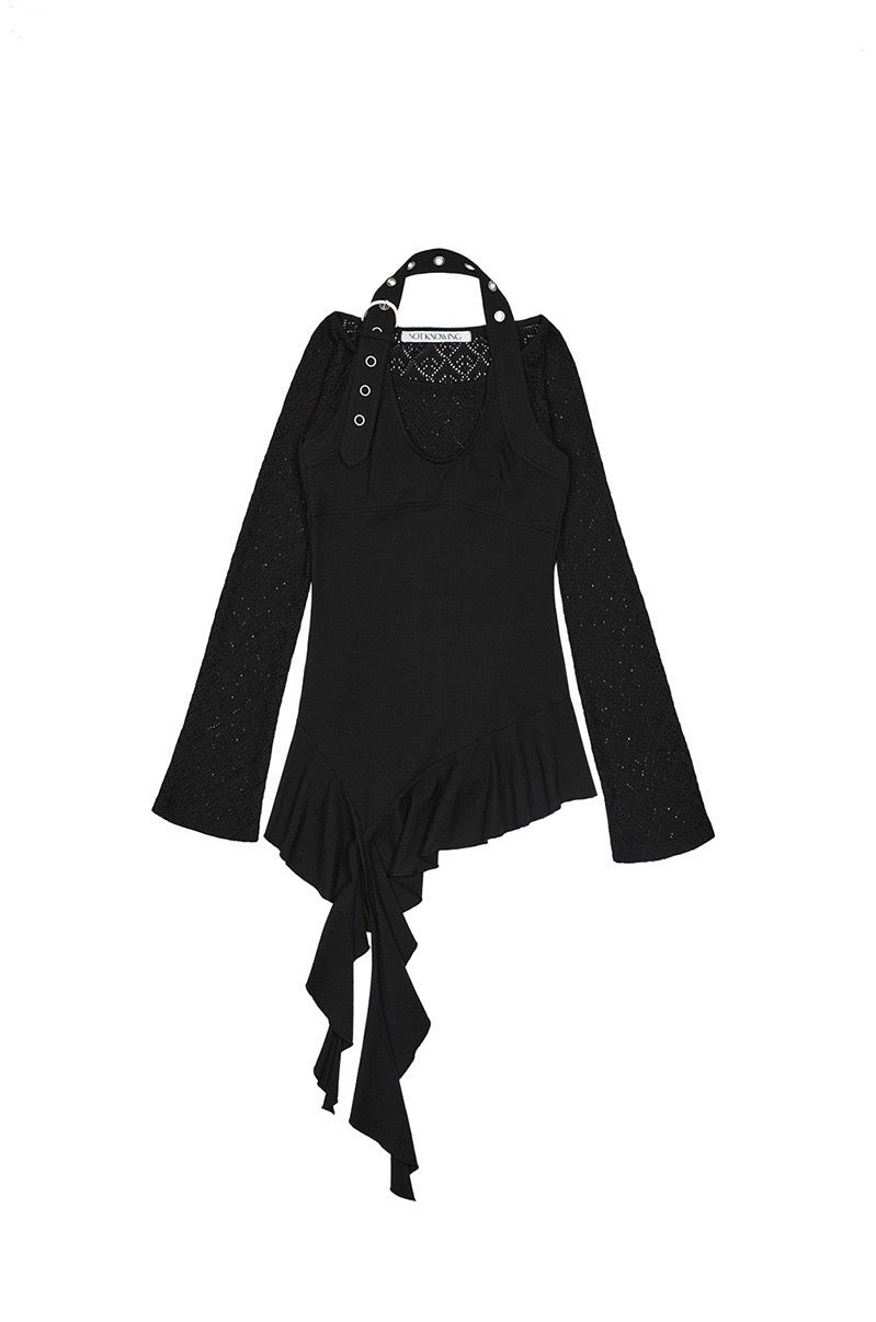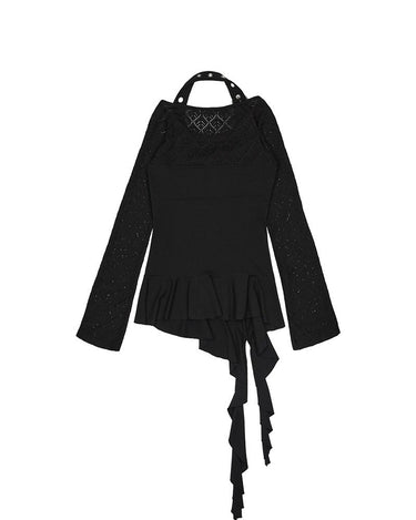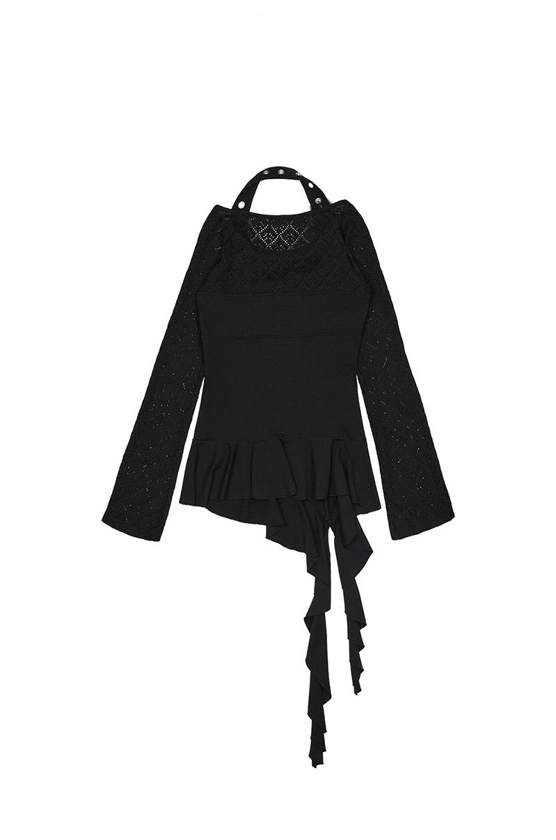Top noir asymétrique à manches longues, alliant jersey de coton stretch et tricot crochet pour un contraste de textures. Son encolure bateau large permet un porté one-shoulder, tandis que le détail façon halter est ajustable grâce à une boucle ceinture. Le top est complété par une ligne de volants tombant asymétriquement, signature de la marque.