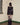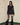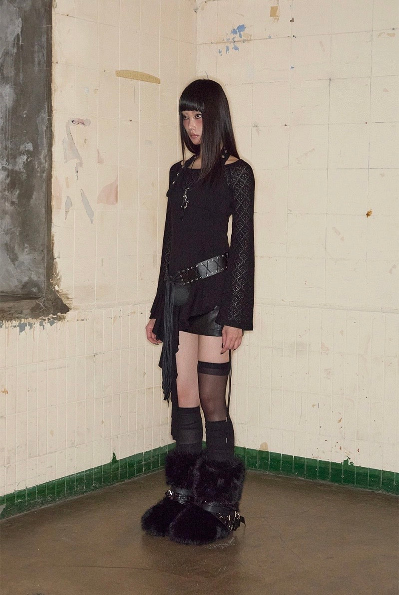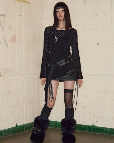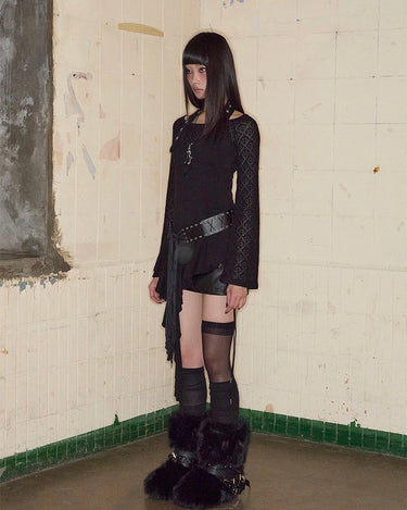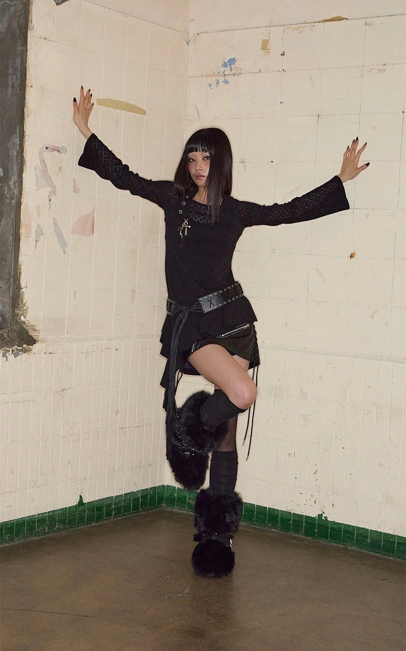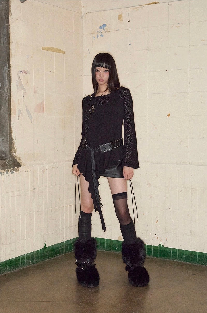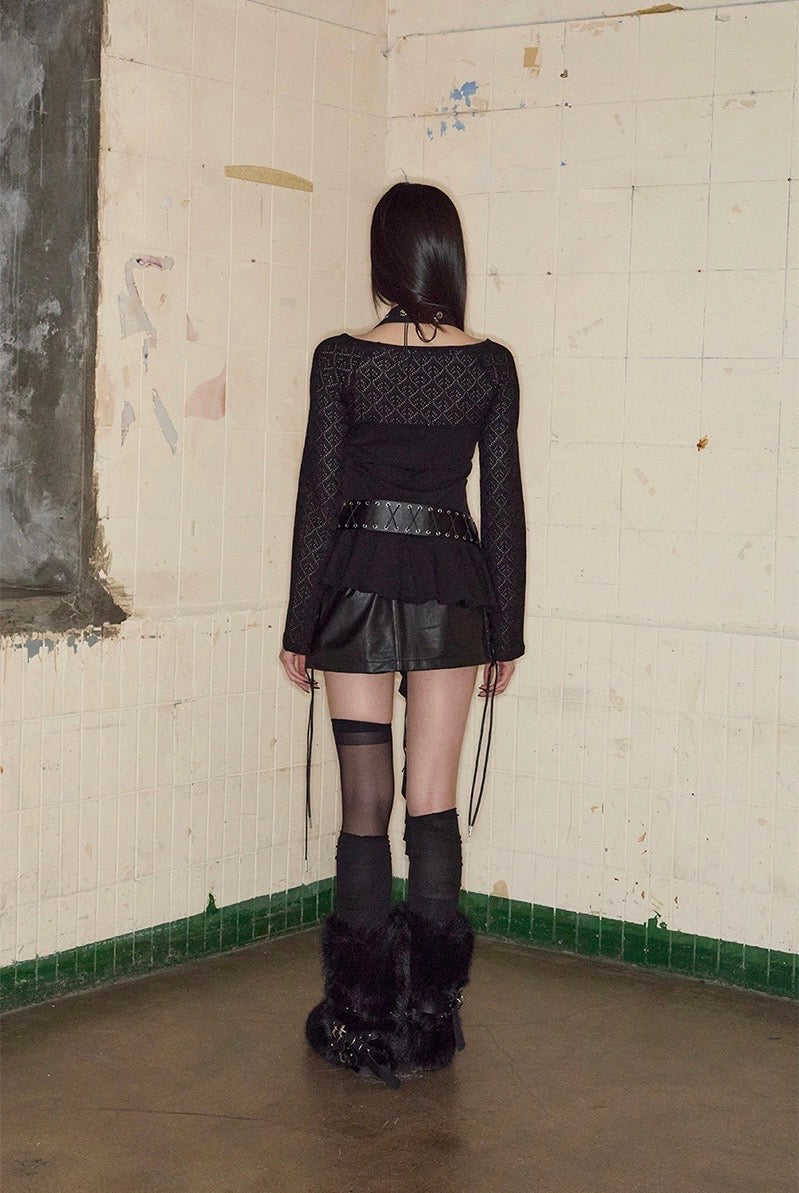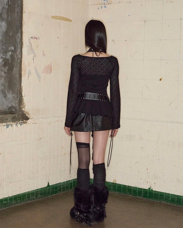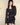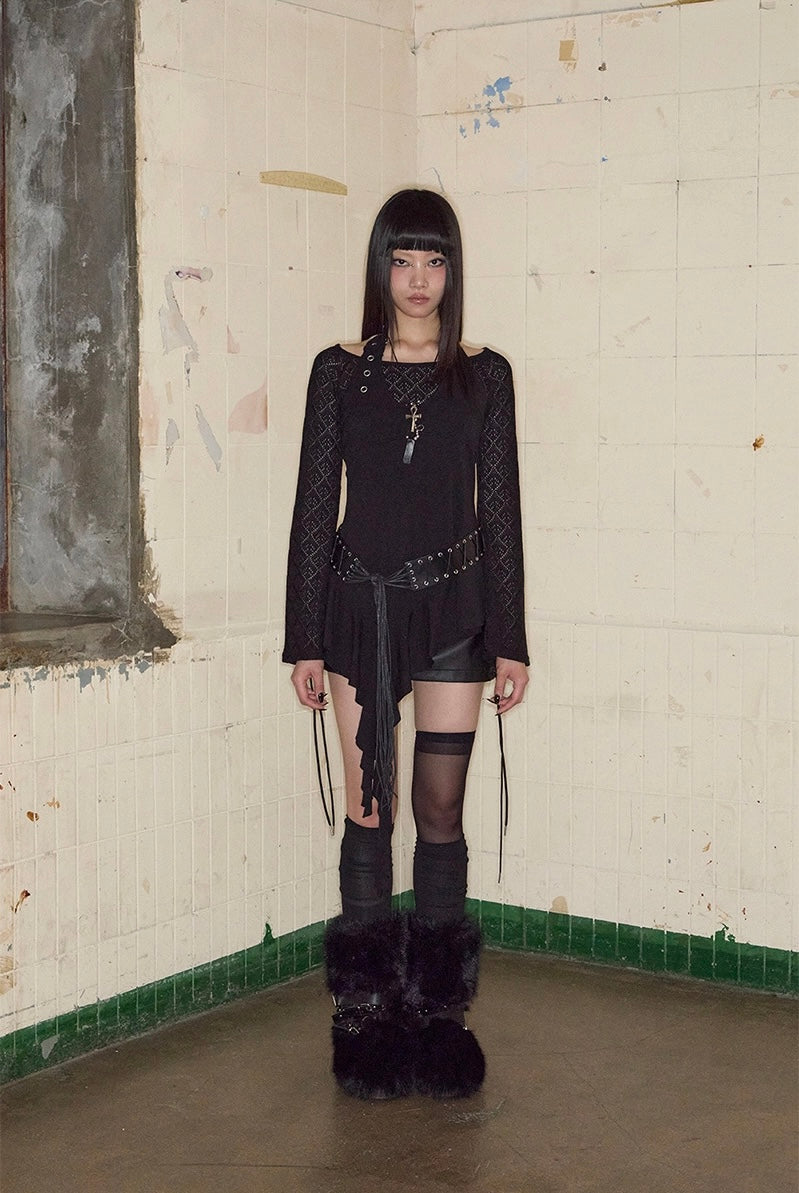 Top noir asymétrique à manches longues, alliant jersey de coton stretch et tricot crochet pour un contraste de textures. Son encolure bateau large permet un porté one-shoulder, tandis que le détail façon halter est ajustable grâce à une boucle ceinture. Le top est complété par une ligne de volants tombant asymétriquement, signature de la marque.