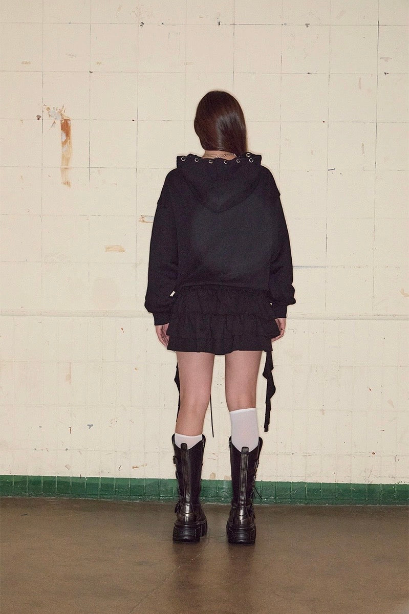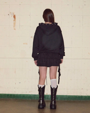 Peut être porté en ensemble avec la Tiered Ruffle Sweat Skirt - BLACK de la même collection.