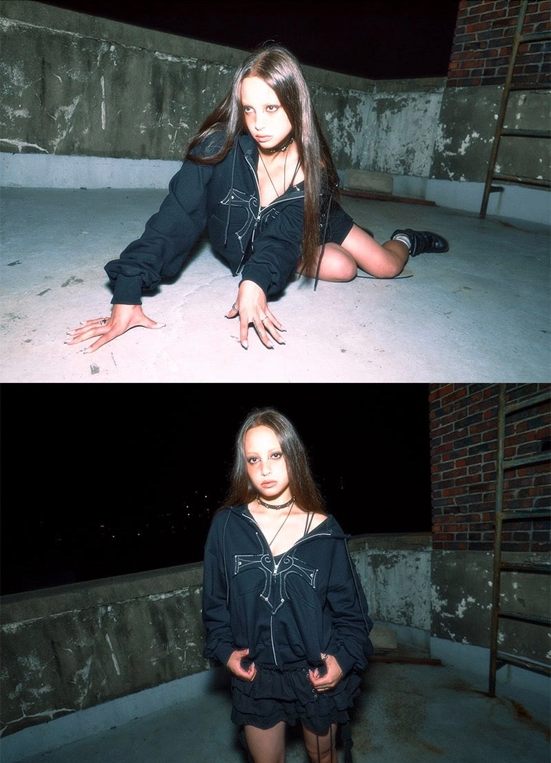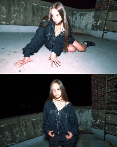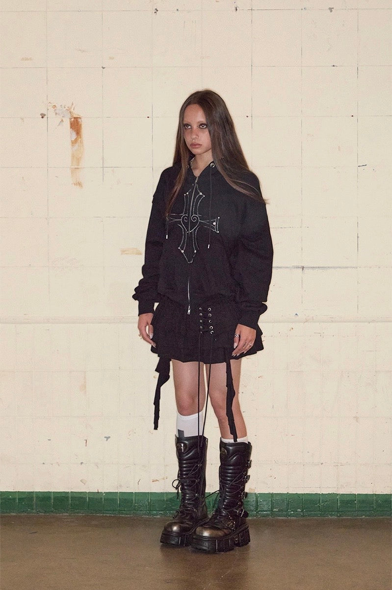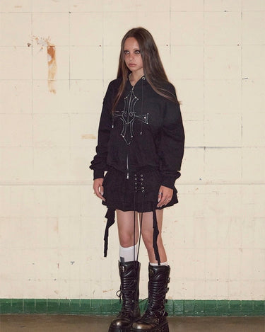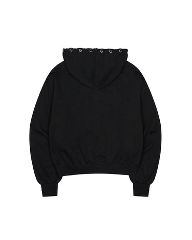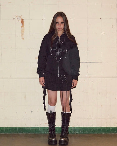 Les bords des poches sont également ornés de studs argentés, tandis que le contour de la capuche présente un lacet passant dans des œillets pour un effet laçage original.
