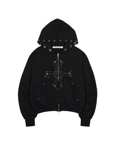 Sweat noir à capuche zippé oversize, confectionné en coton doux pour un confort optimal.