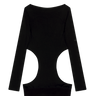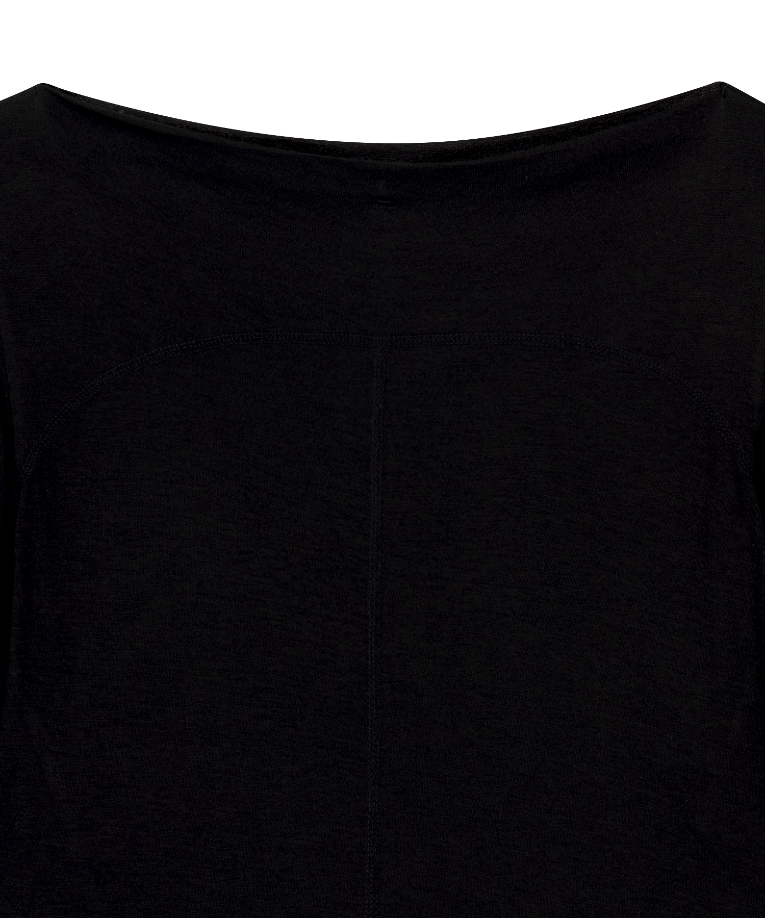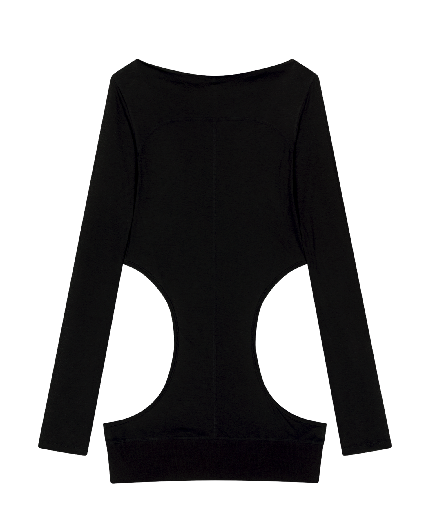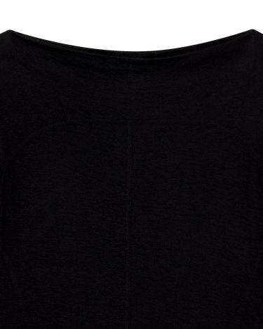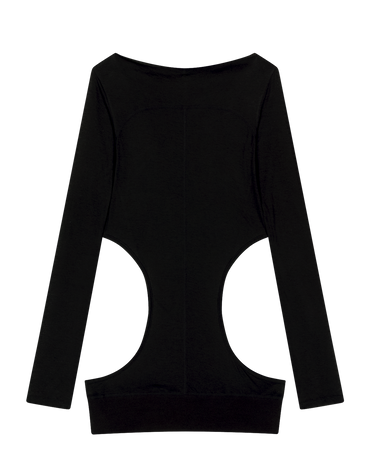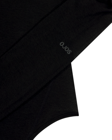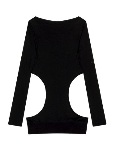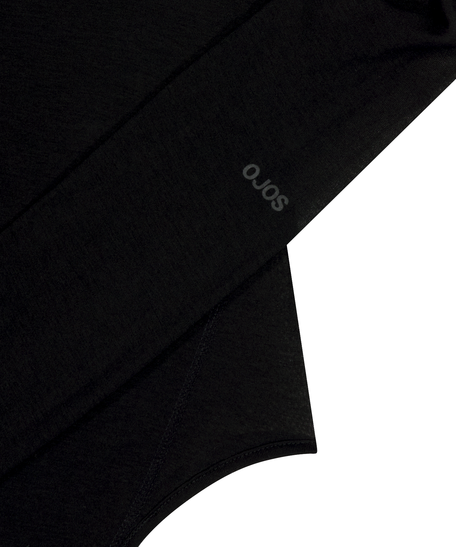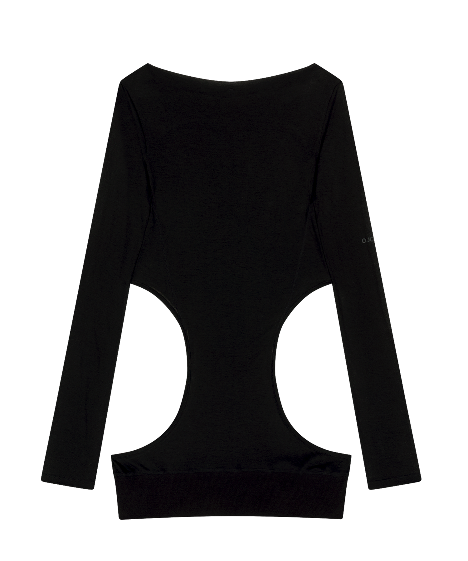 Black long-sleeve T-shirt with a slim fit, featuring cut-out details on the sides. It stands out for its multi-styling design, allowing it to be worn in multiple ways — as a dress, a top, layered, or reversed, with the front and back or top and bottom interchangeable. An OJOS logo is printed on the right sleeve. Made from a blend of Tencel™ and wool, it offers a soft and fluid texture to the touch.