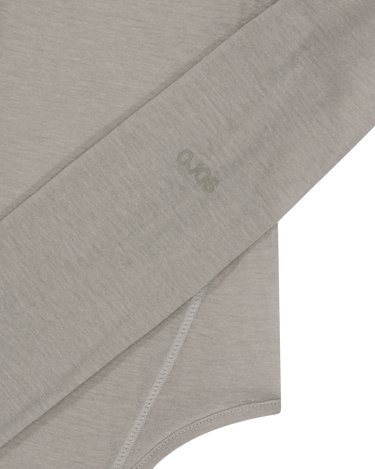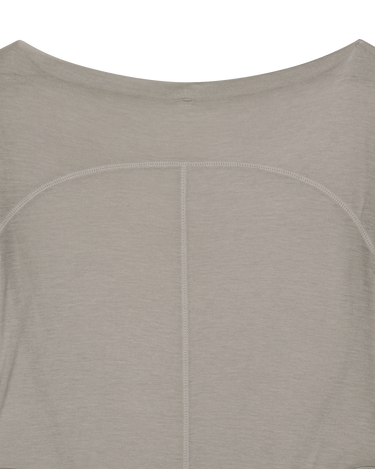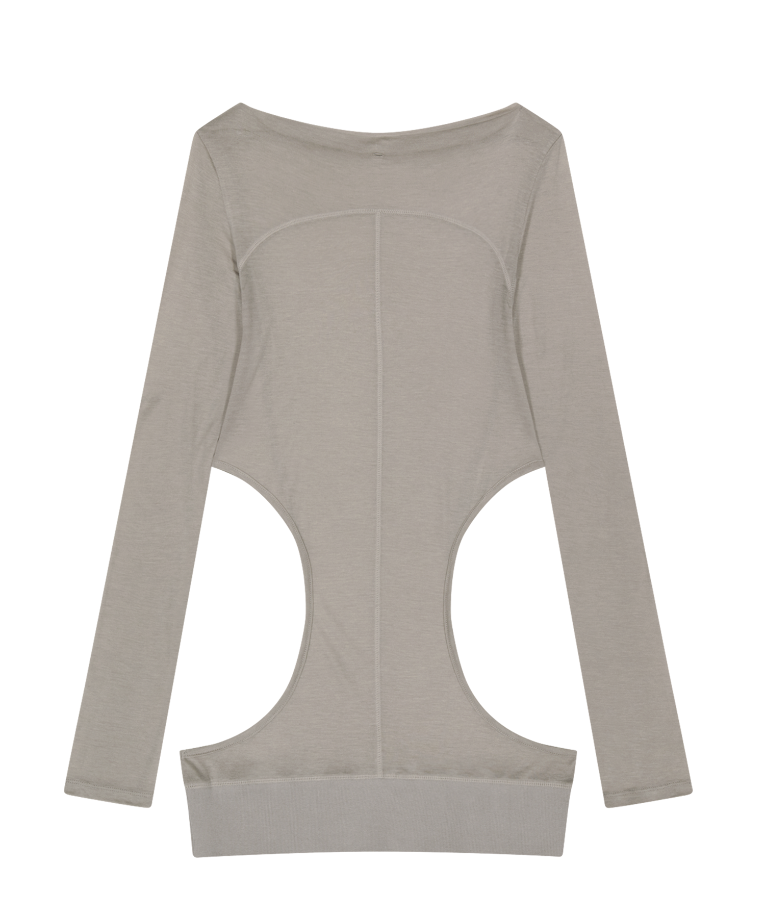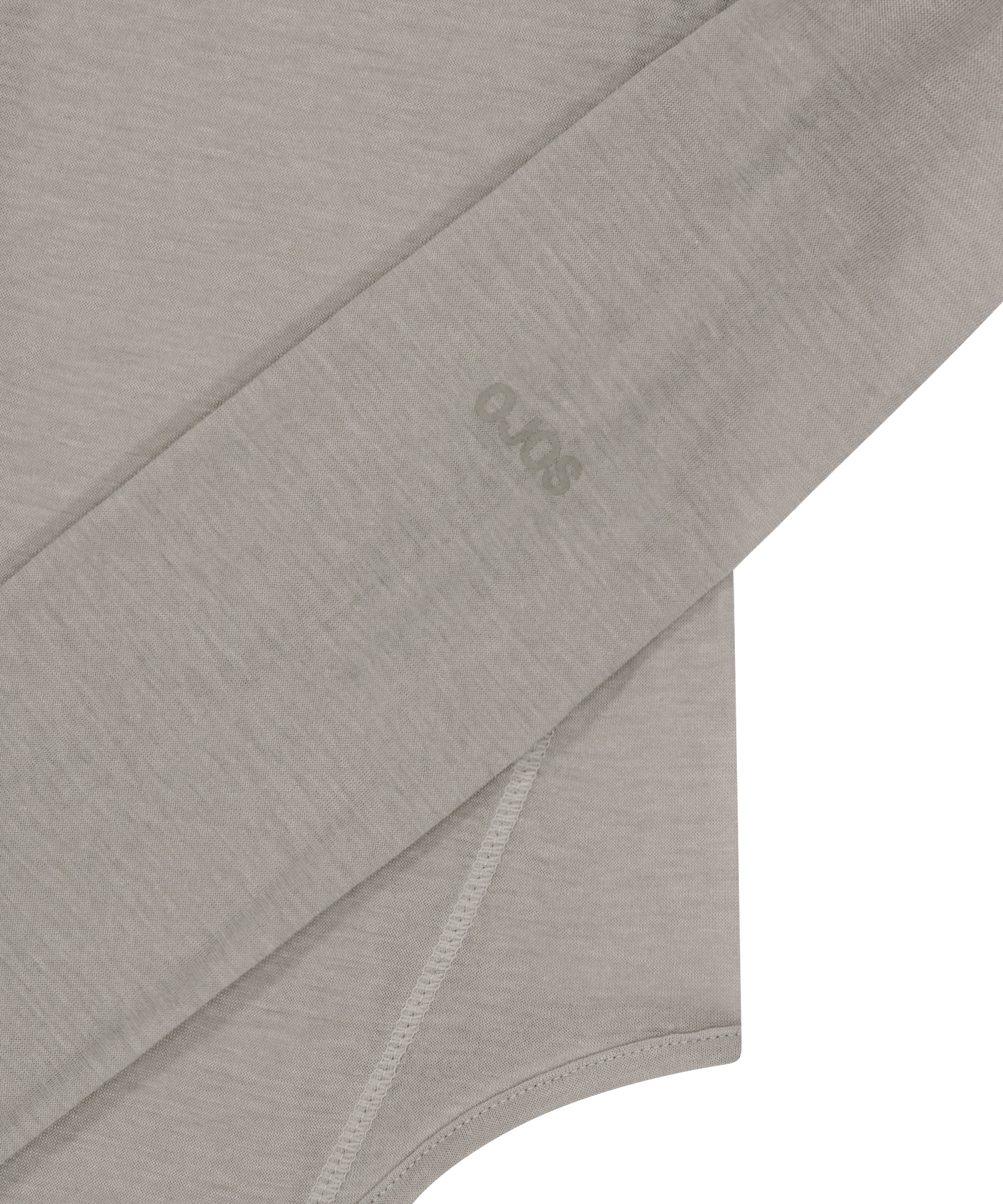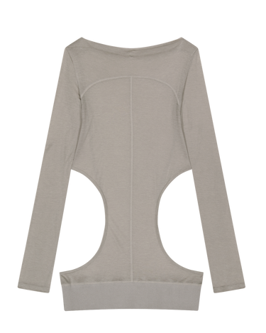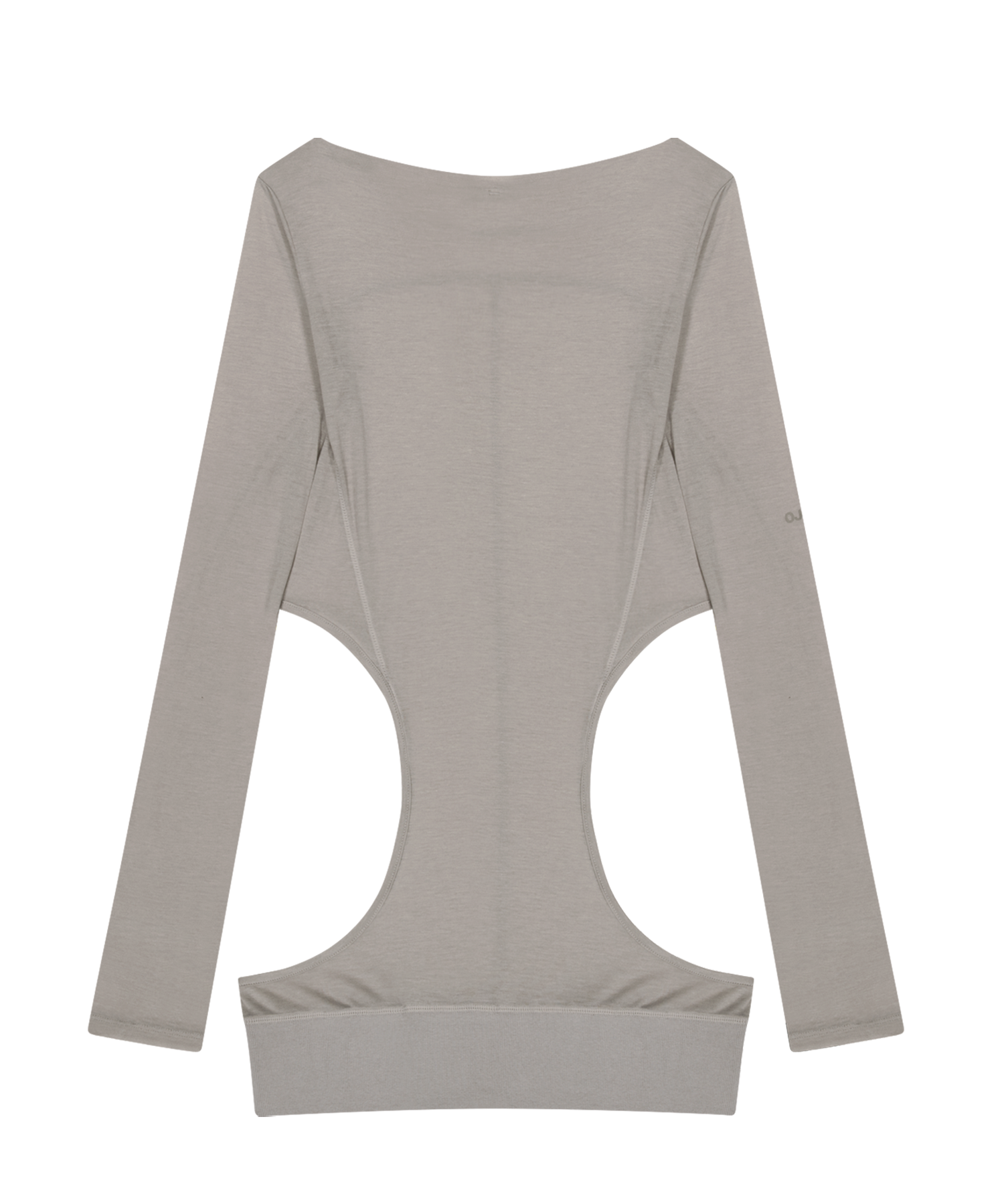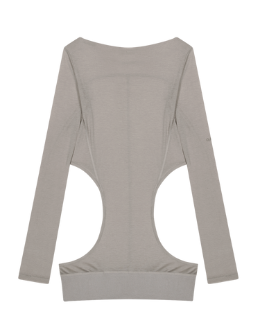 Beige-grey long-sleeve T-shirt with a slim fit, featuring cut-out details on the sides. It stands out for its multi-styling design, allowing it to be worn in multiple ways — as a dress, a top, layered, or reversed, with the front and back or top and bottom interchangeable. An OJOS logo is printed on the right sleeve. Made from a blend of Tencel™ and wool, it offers a soft and fluid texture to the touch.