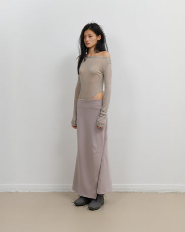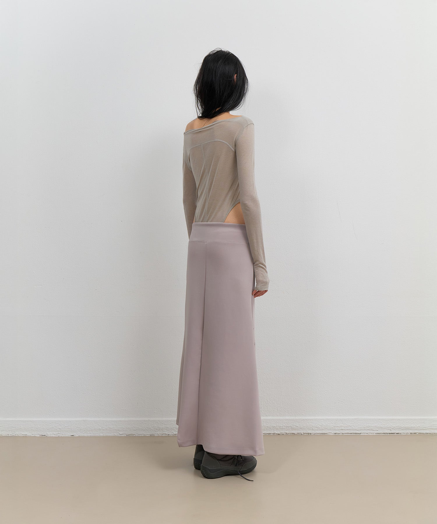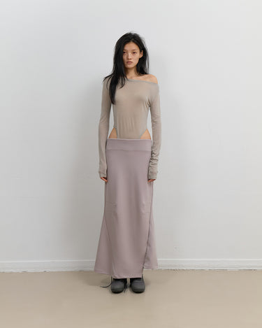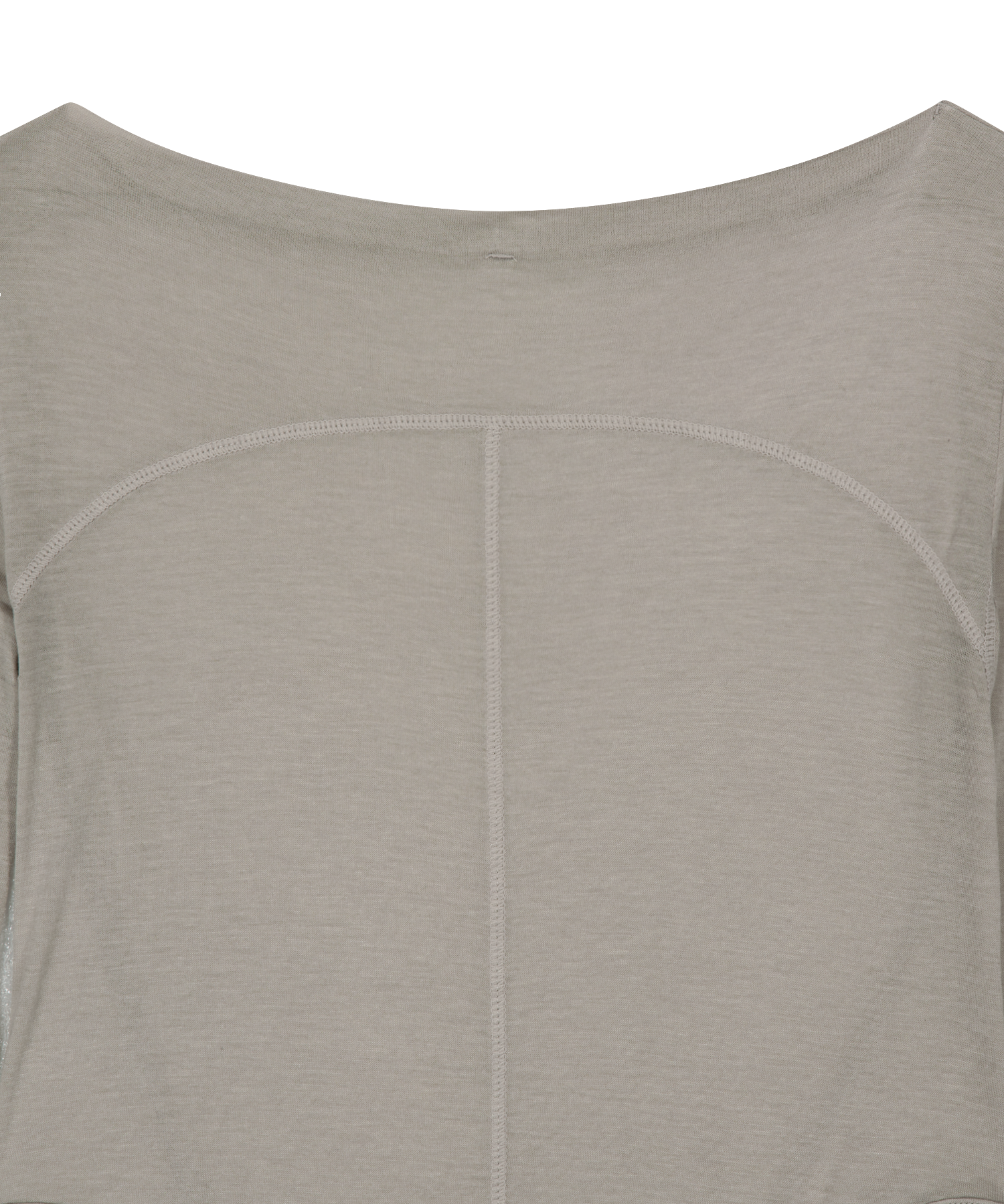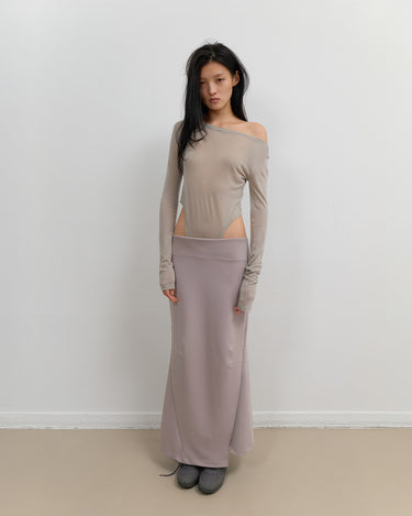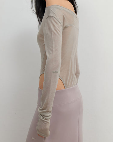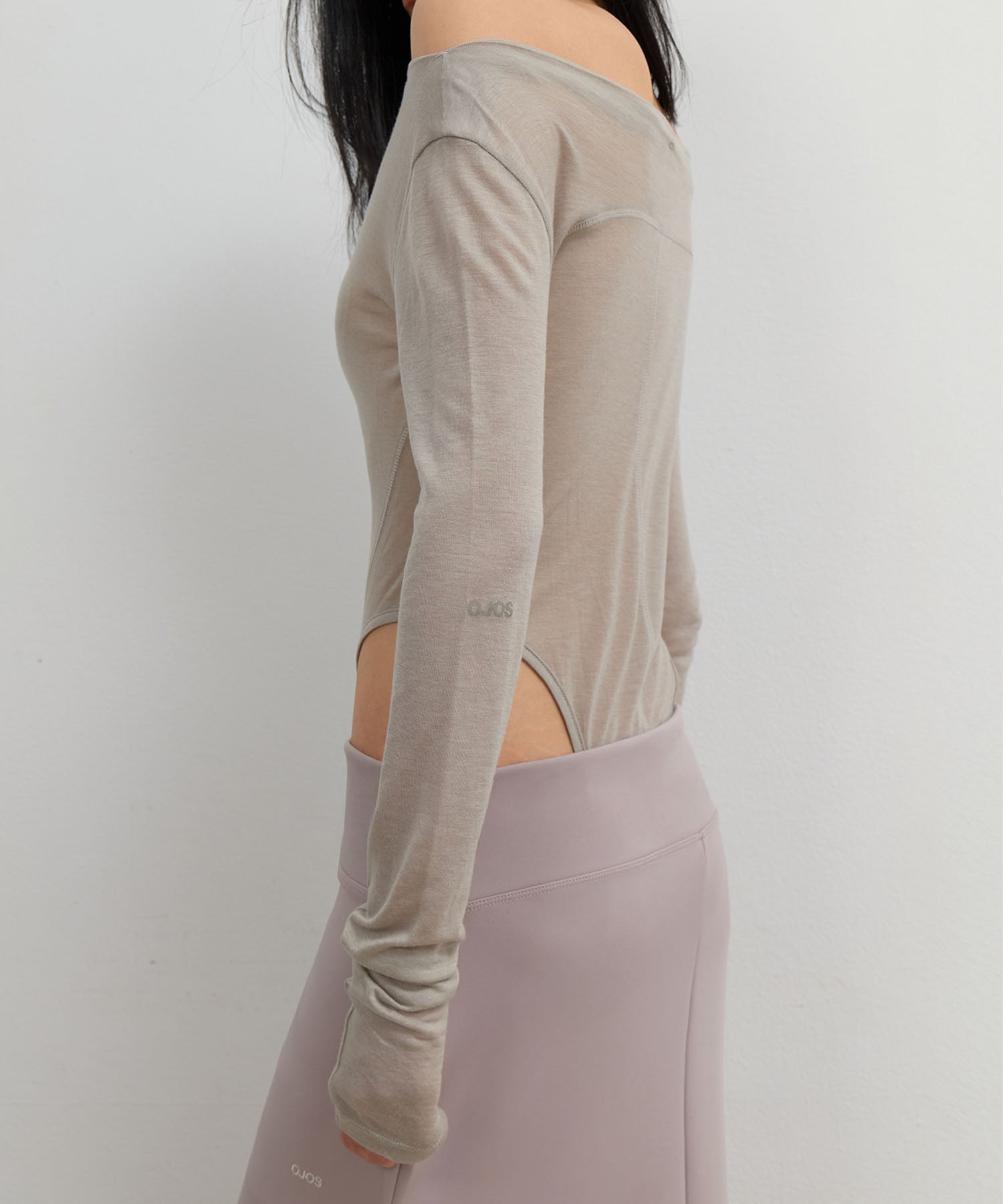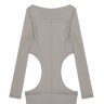 Beige-grey long-sleeve T-shirt with a slim fit, featuring cut-out details on the sides. It stands out for its multi-styling design, allowing it to be worn in multiple ways — as a dress, a top, layered, or reversed, with the front and back or top and bottom interchangeable. An OJOS logo is printed on the right sleeve. Made from a blend of Tencel™ and wool, it offers a soft and fluid texture to the touch.