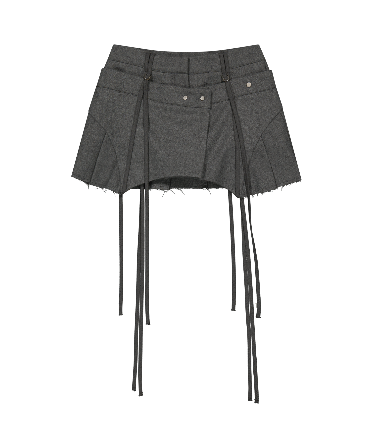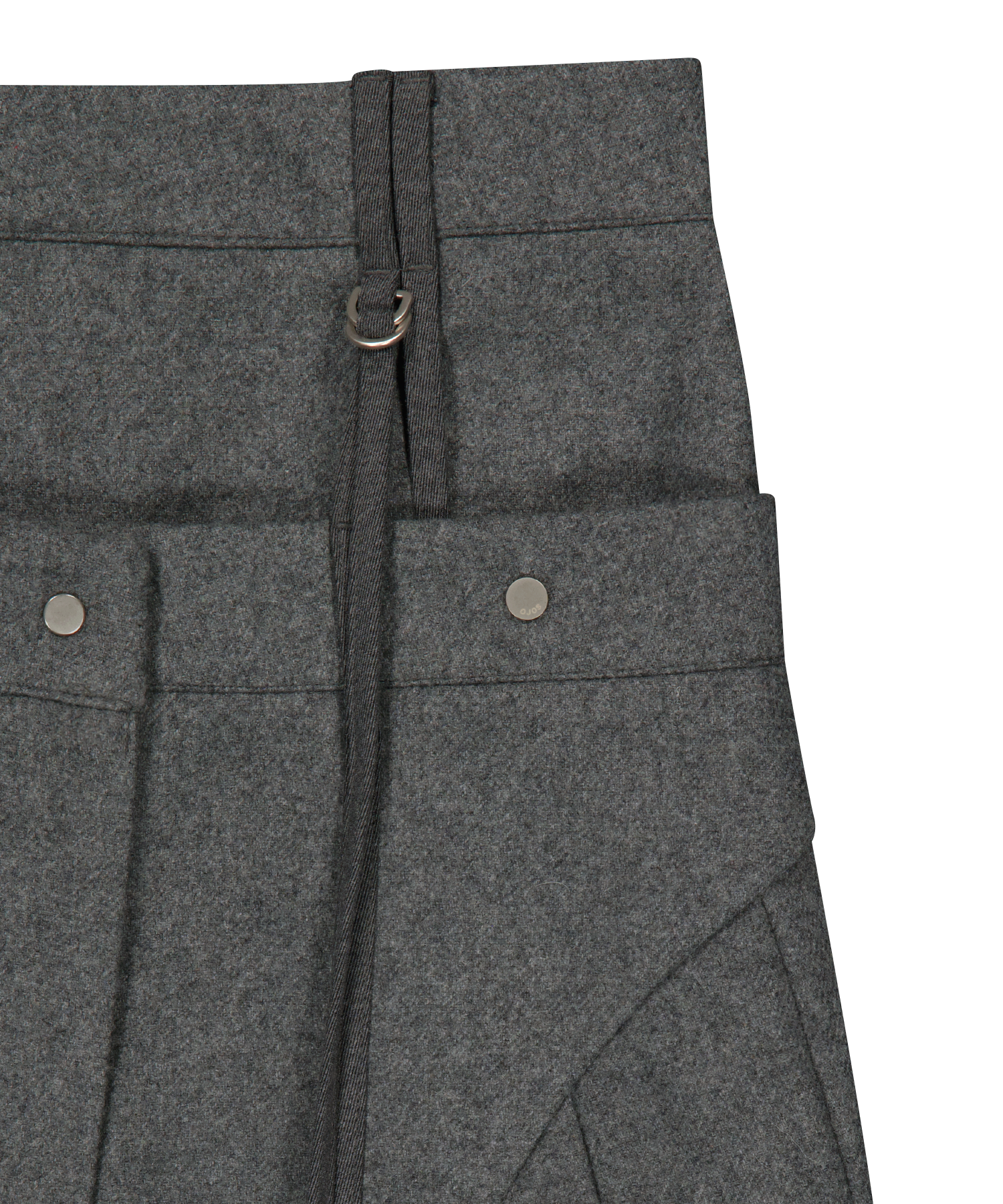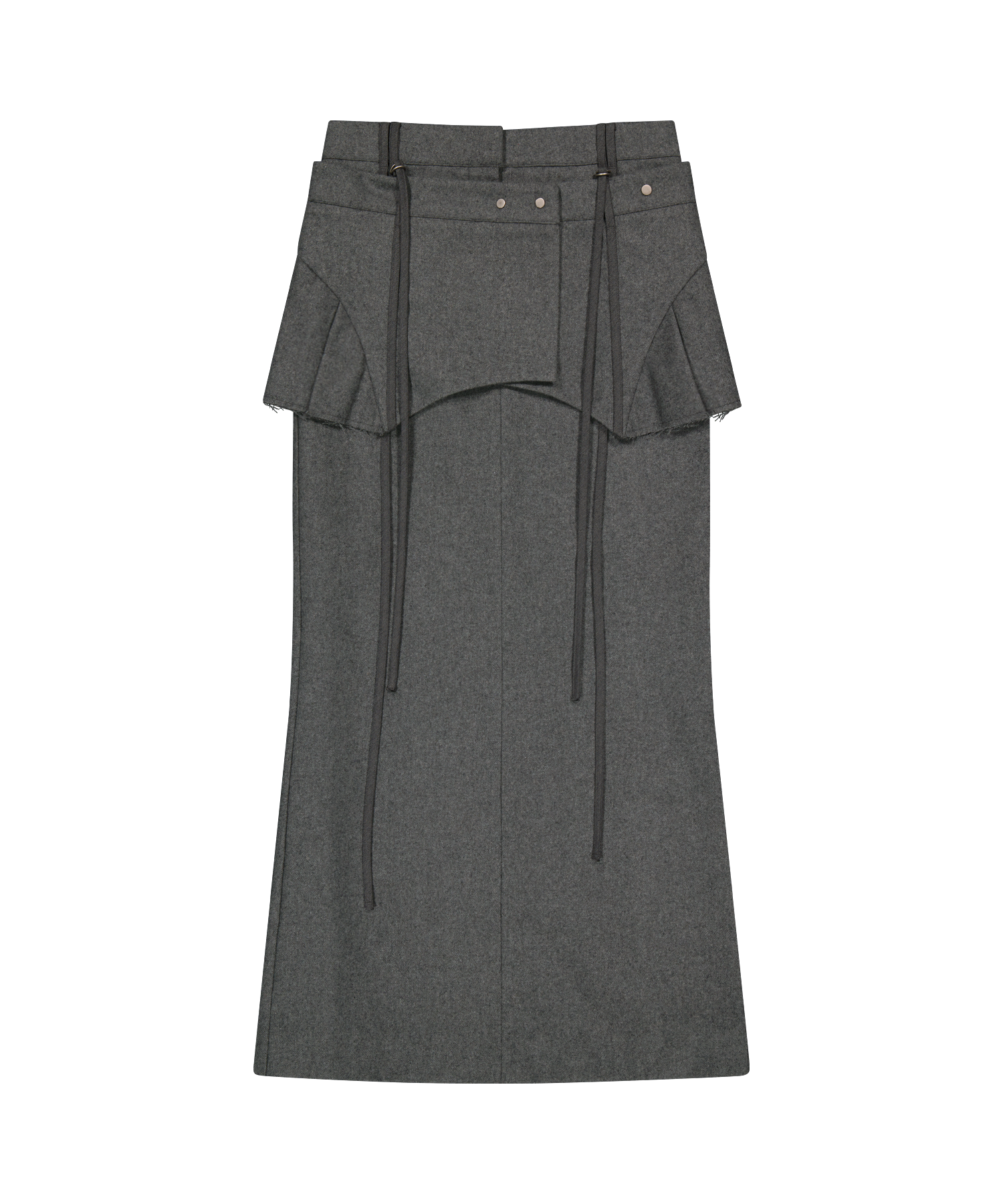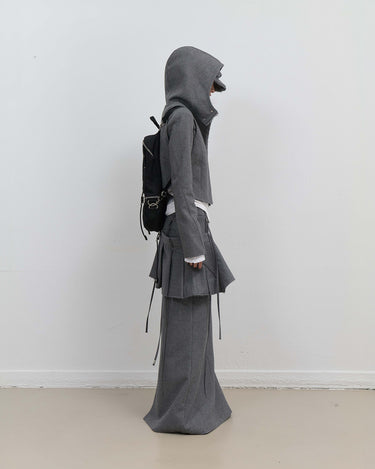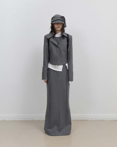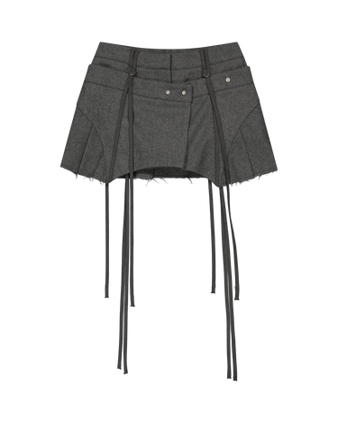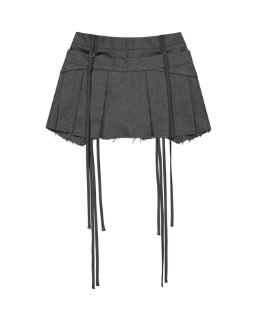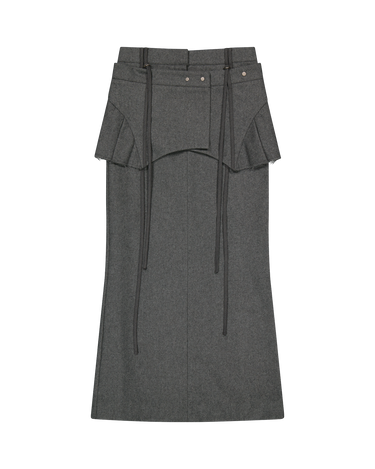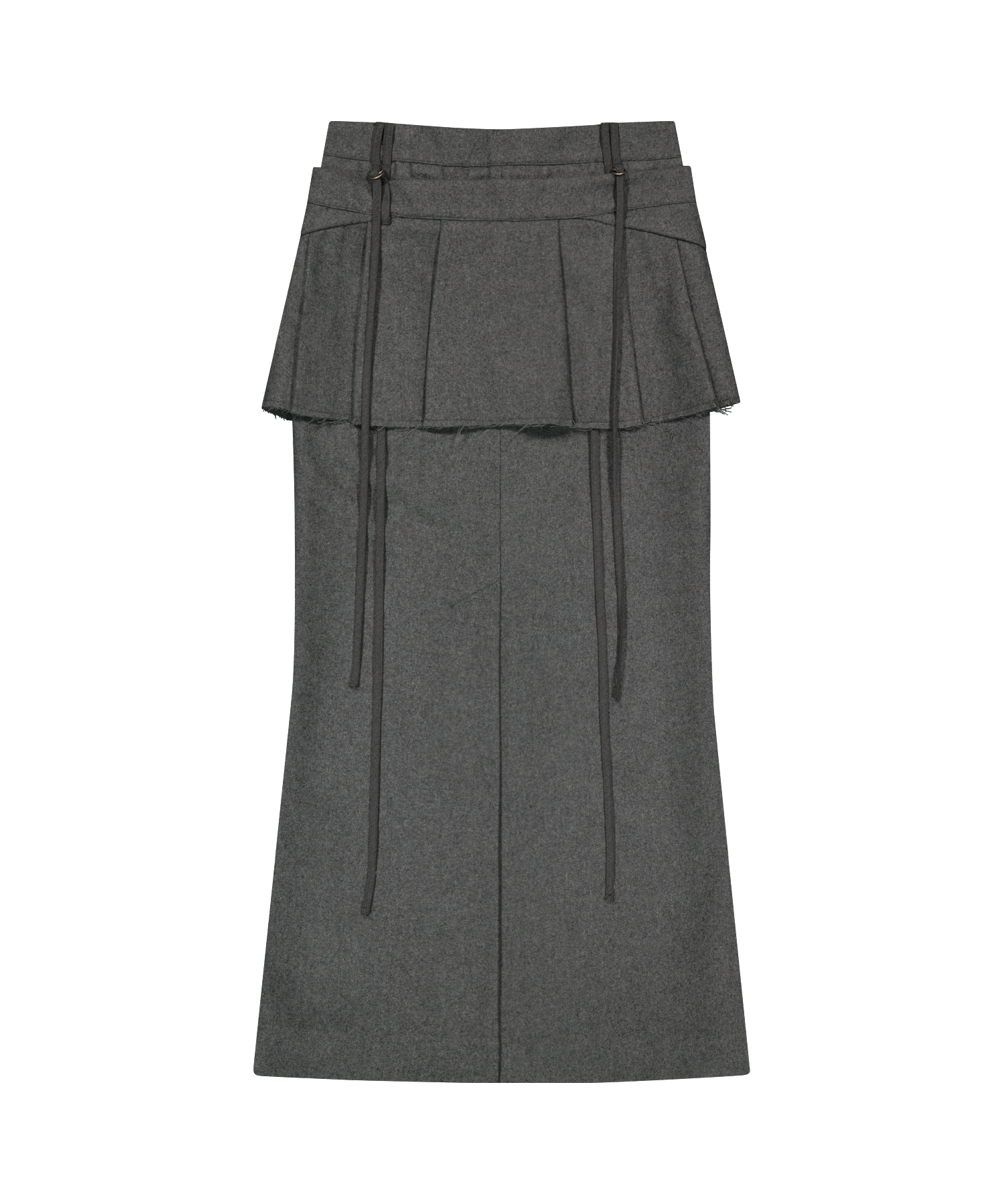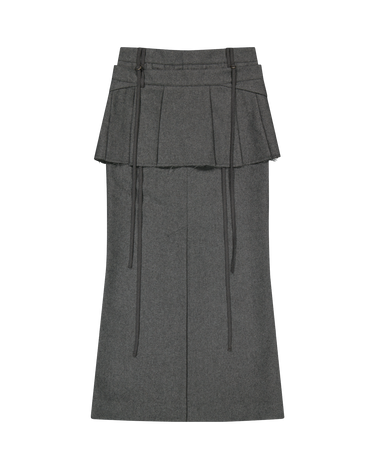 Set composed of a micro pleated mini skirt and a long mermaid-cut skirt, both in grey wool, offering warmth and a refined texture.