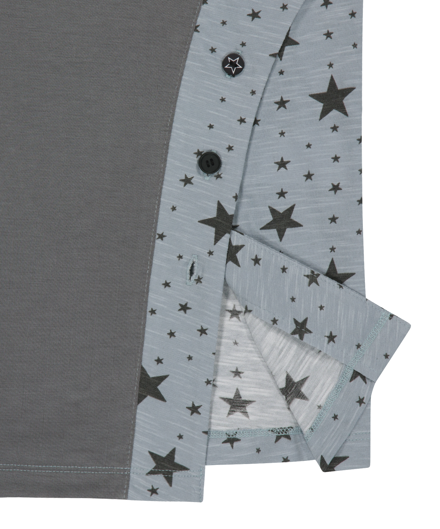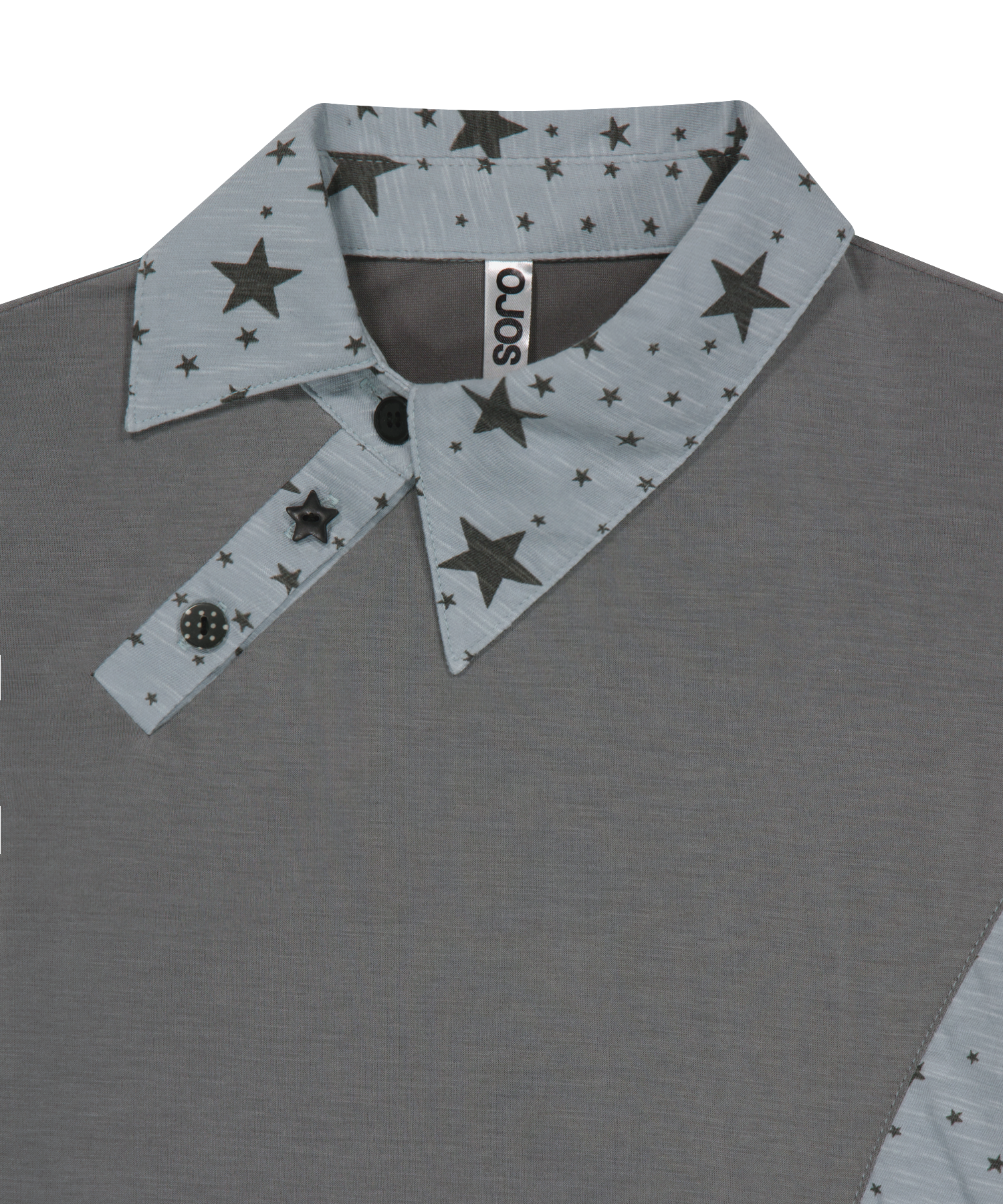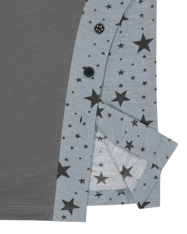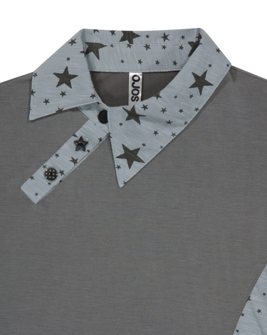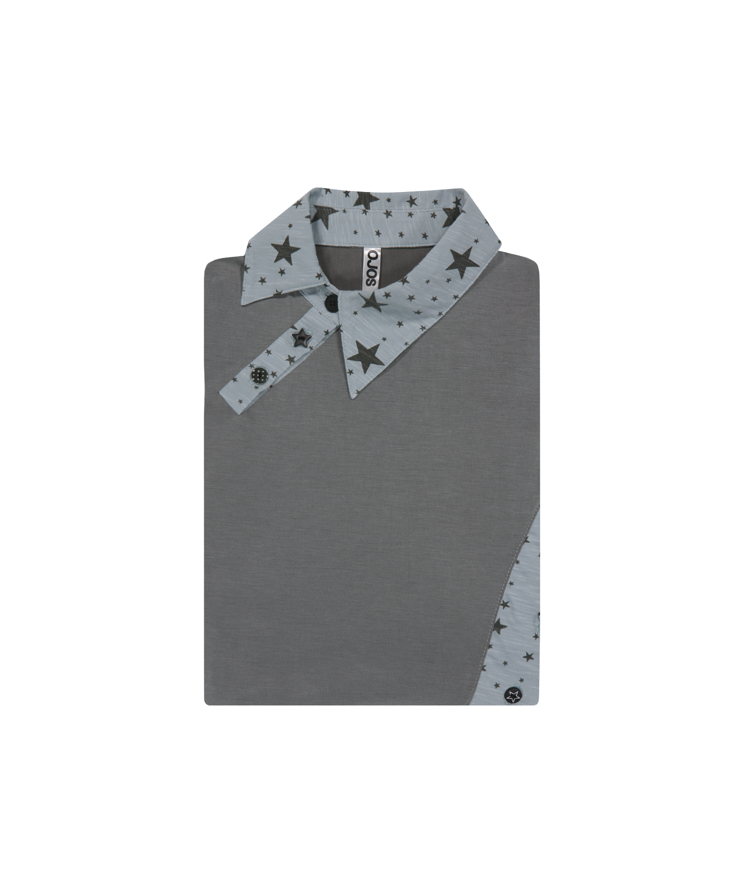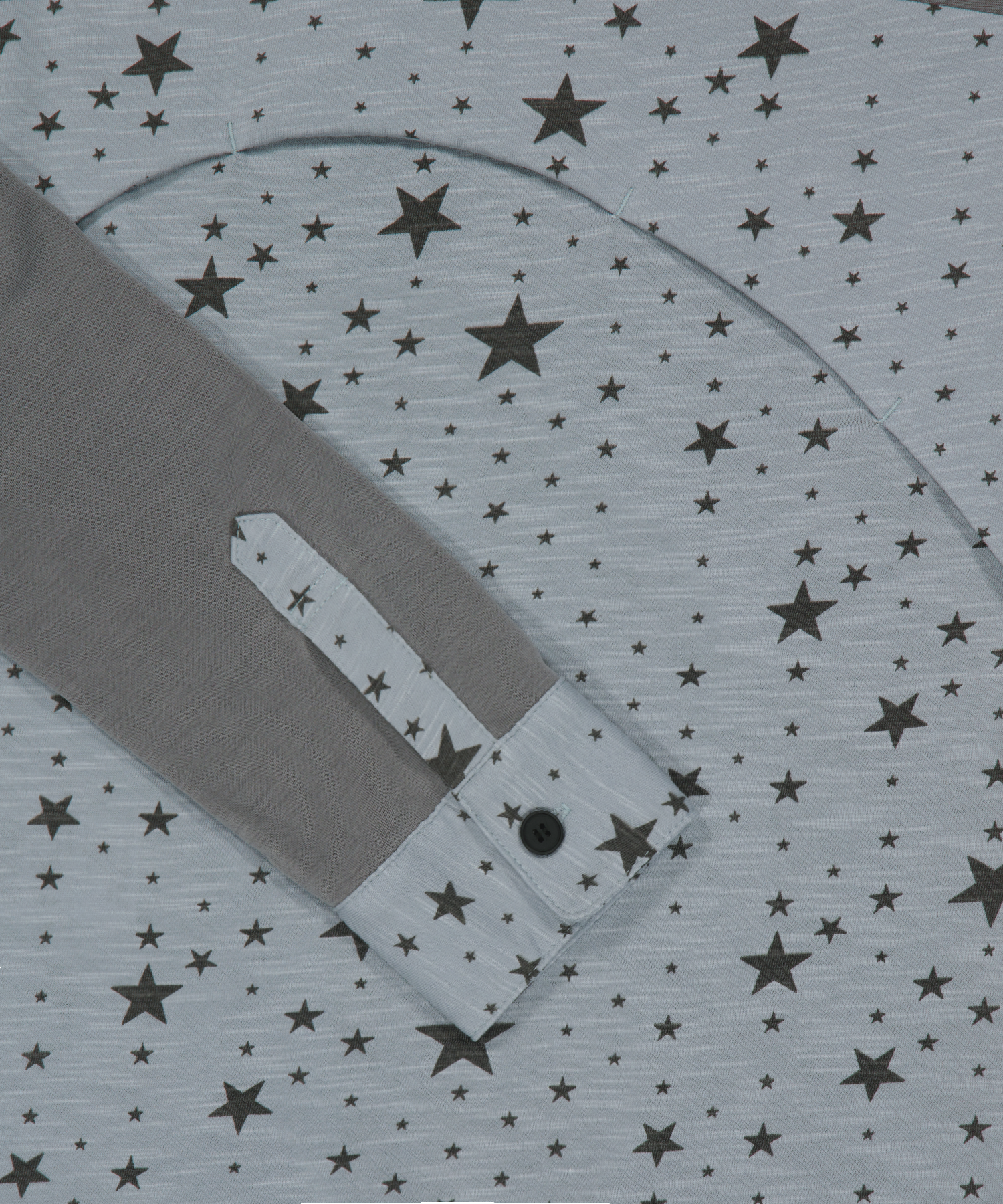It features a diagonal front closure, an asymmetric collar, and assorted buttons that add an original finishing touch. The collar, cuffs, and sides are crafted from a contrasting sky-blue star-patterned fabric, matching the back panel. Overlapping curved seams at the back structure and enhance the silhouette.