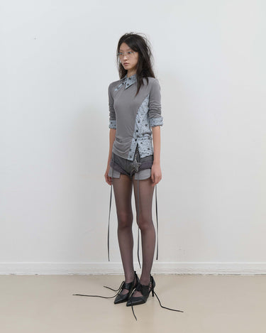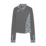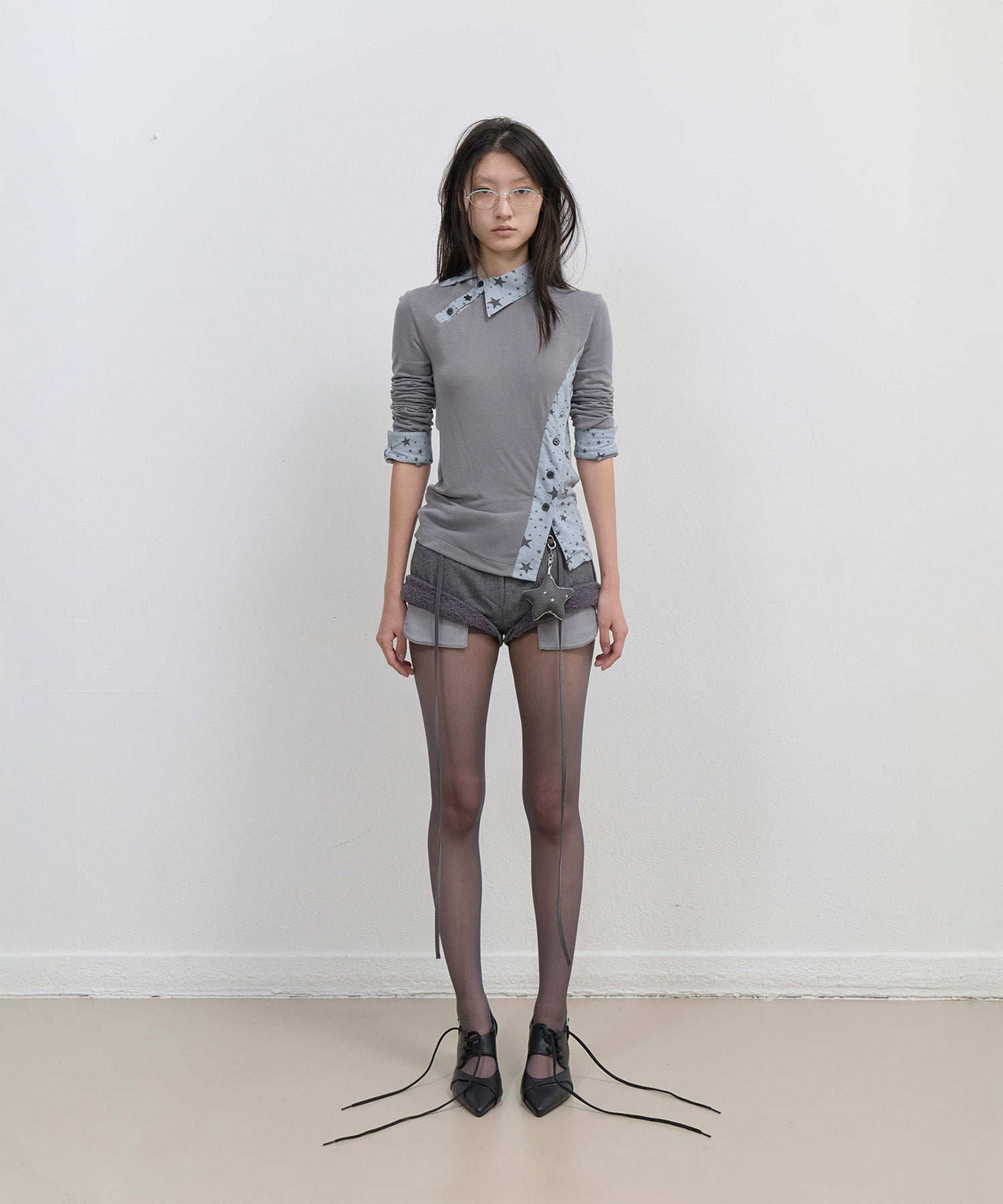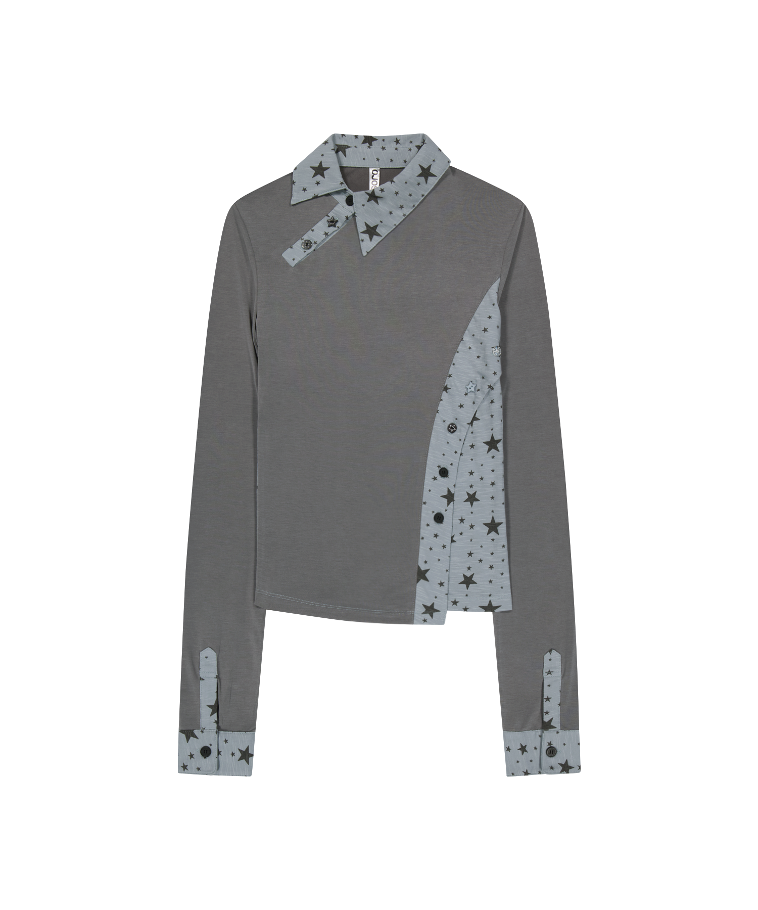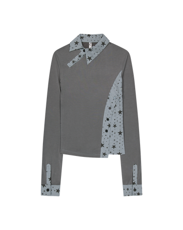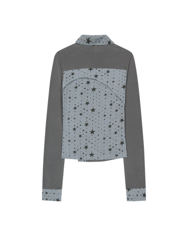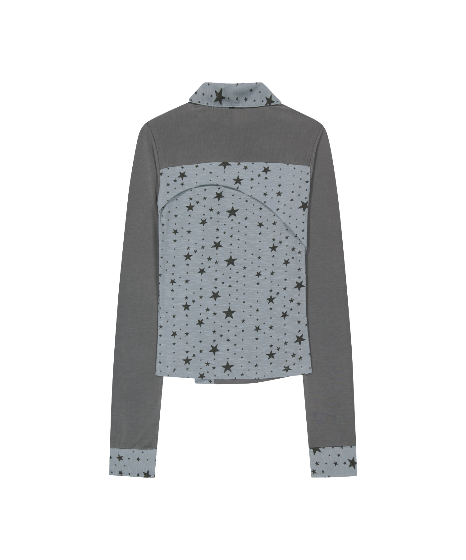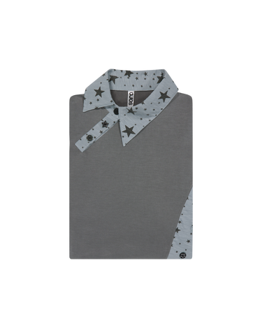 It features a diagonal front closure, an asymmetric collar, and assorted buttons that add an original finishing touch. The collar, cuffs, and sides are crafted from a contrasting sky-blue star-patterned fabric, matching the back panel. Overlapping curved seams at the back structure and enhance the silhouette.