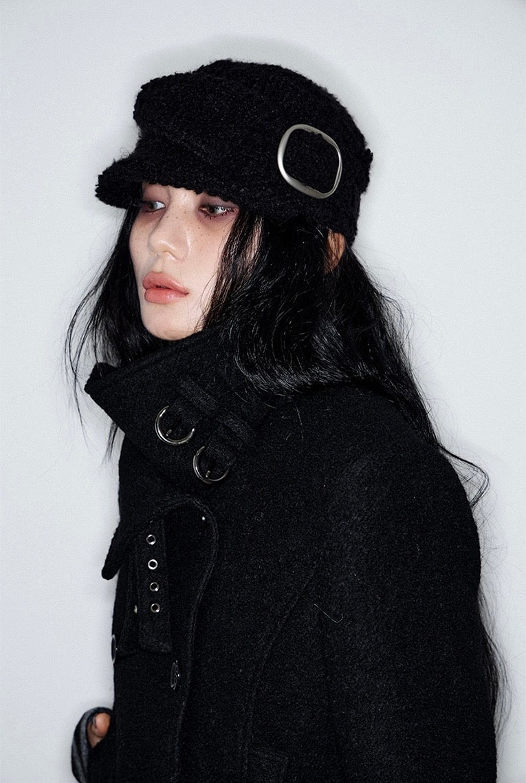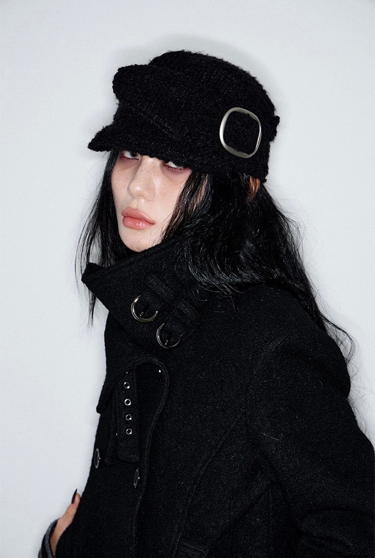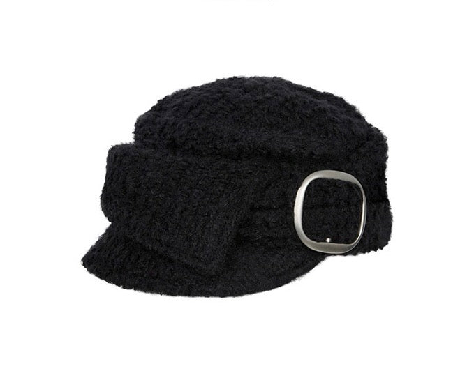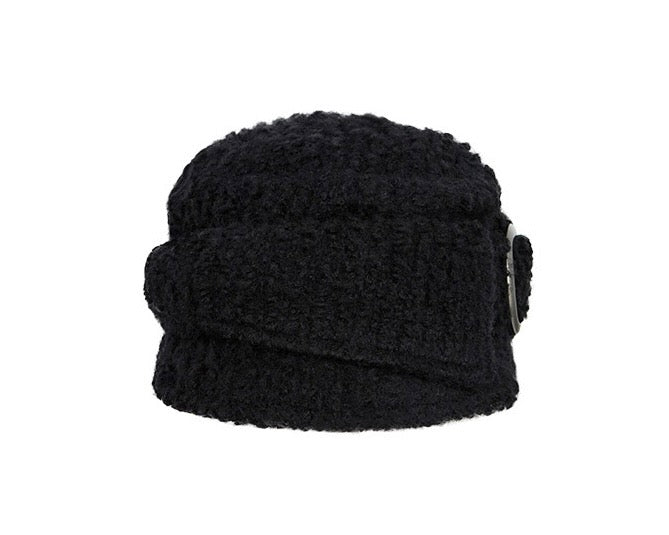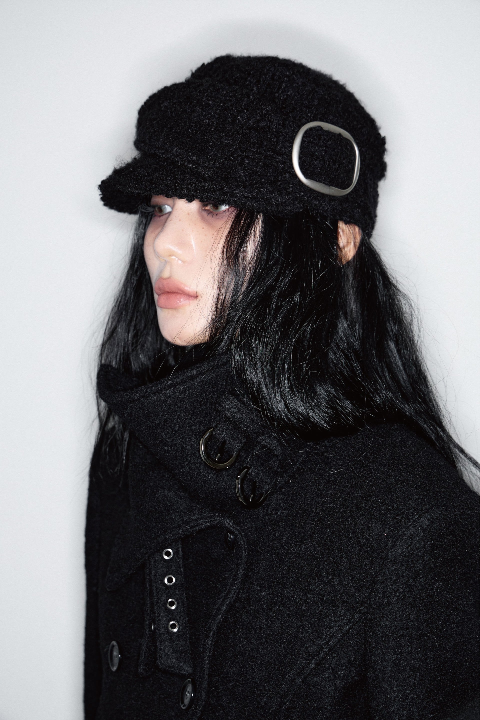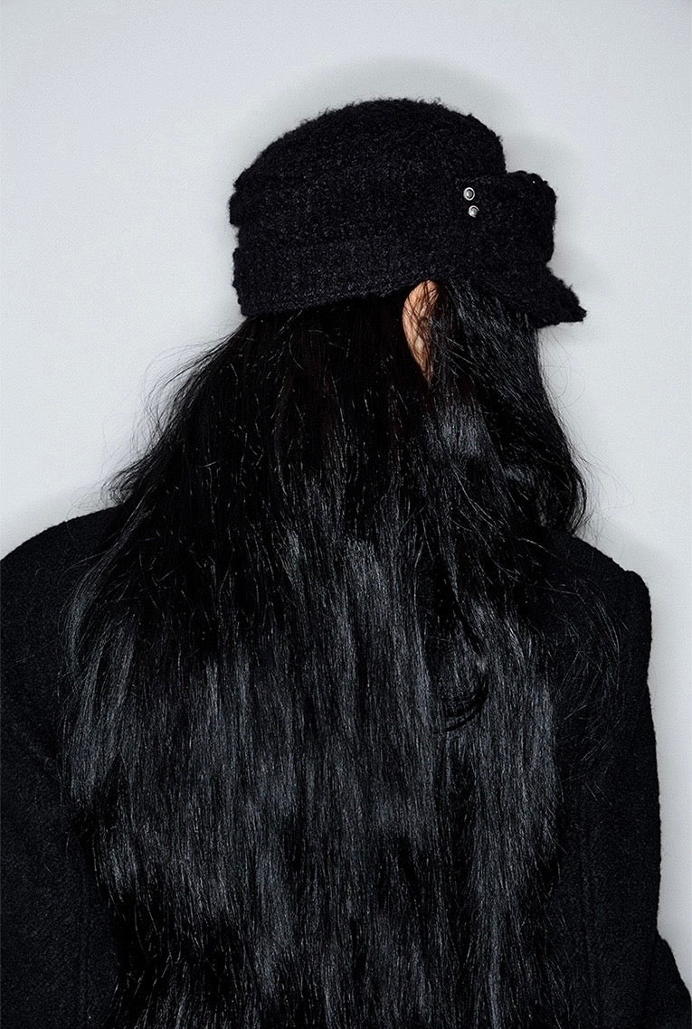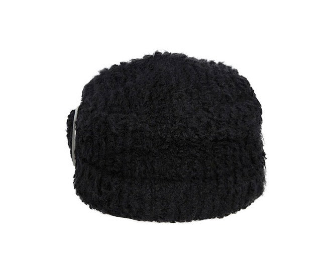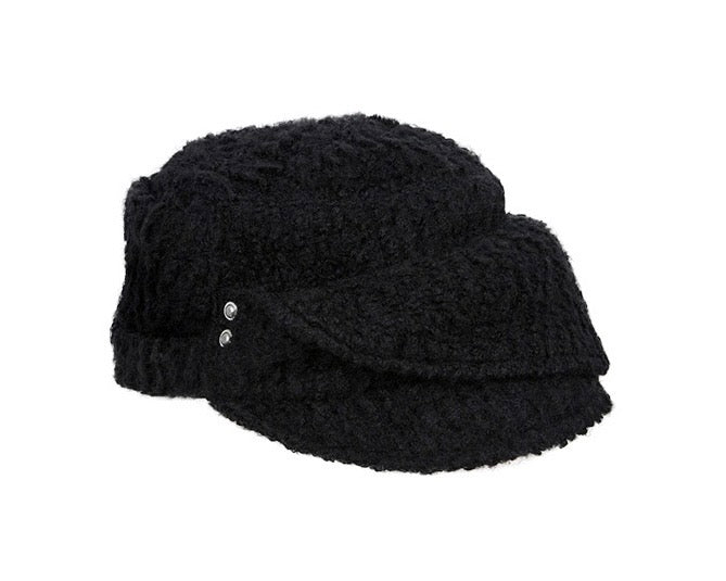 Black bellboy cap made of hairy boucle fabric, offering a soft and warm touch.