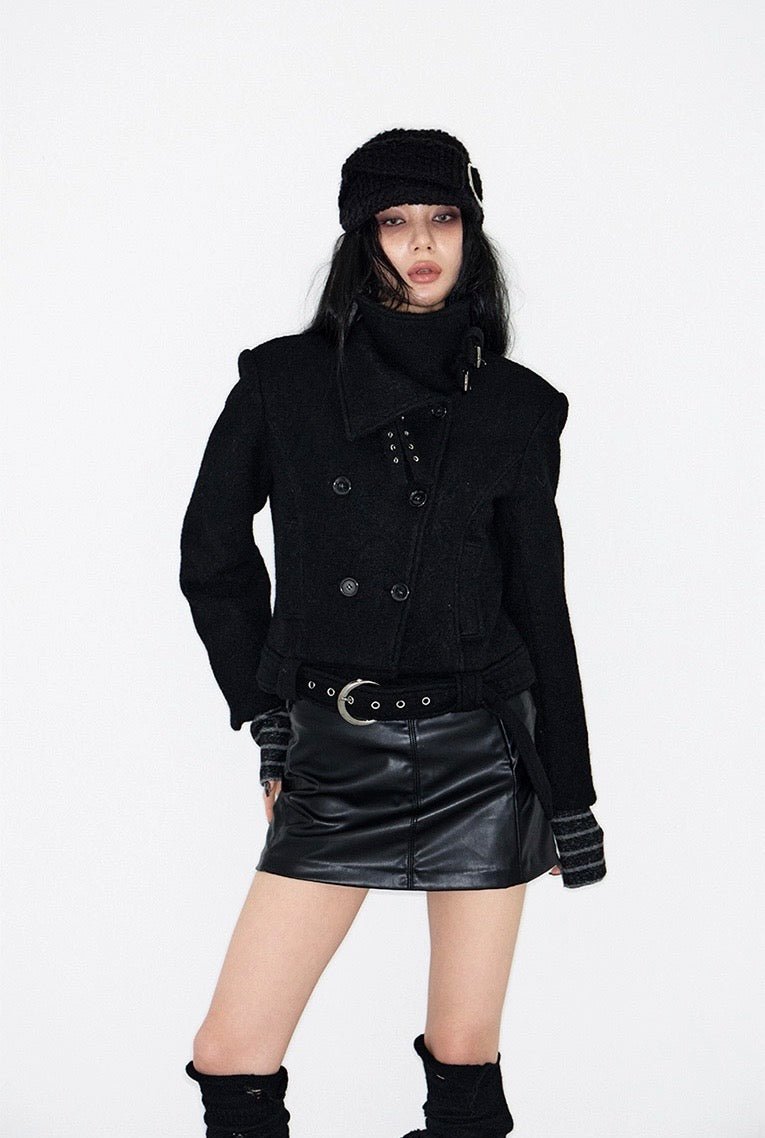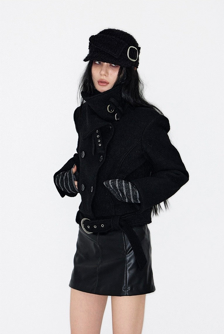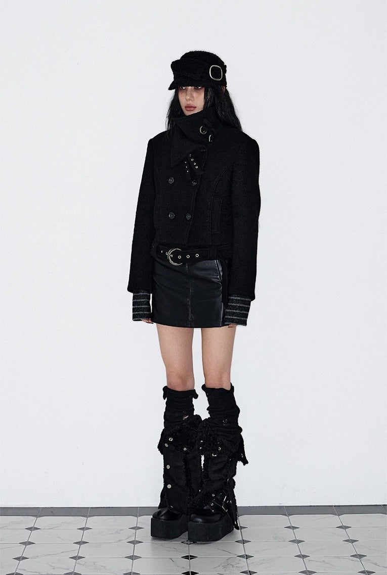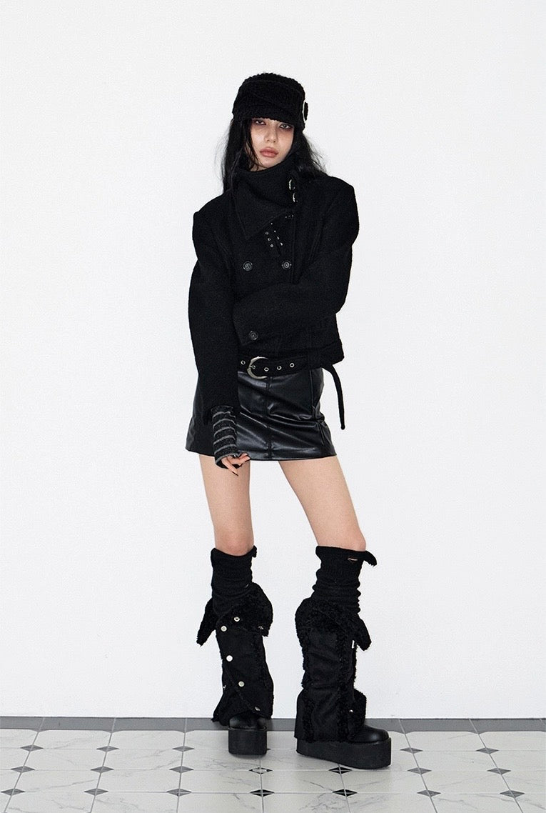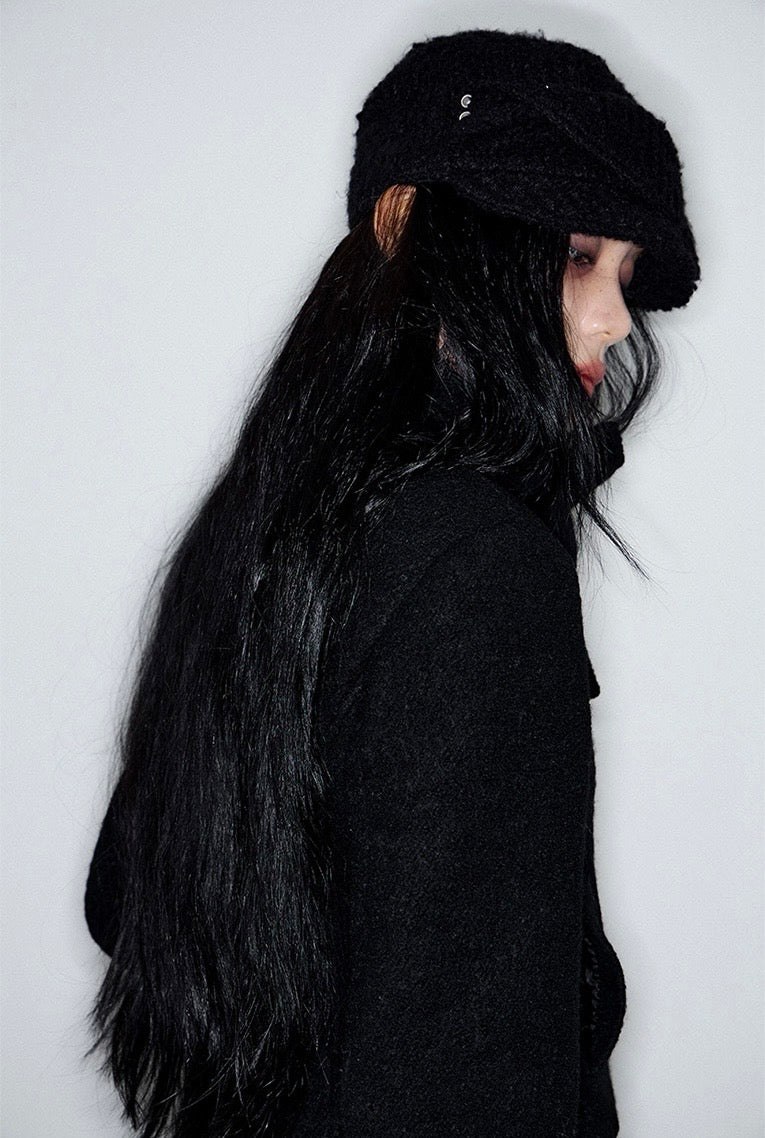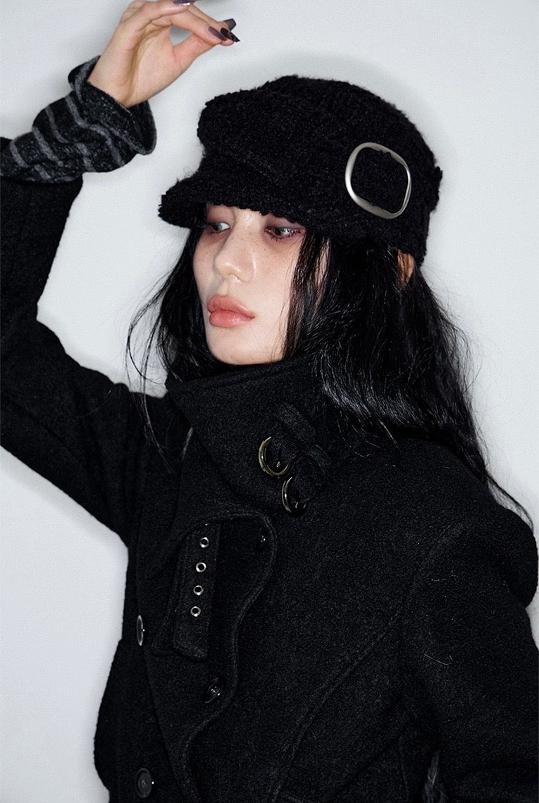 Black bellboy cap made of hairy boucle fabric, offering a soft and warm touch.