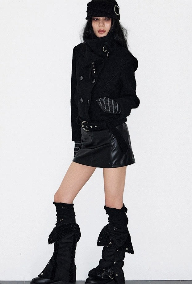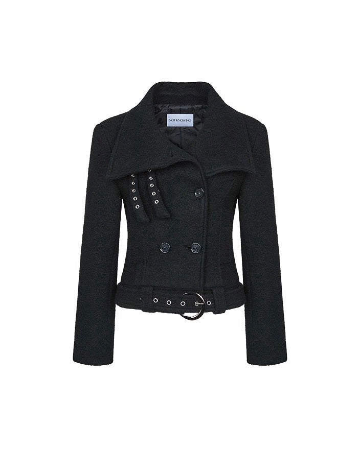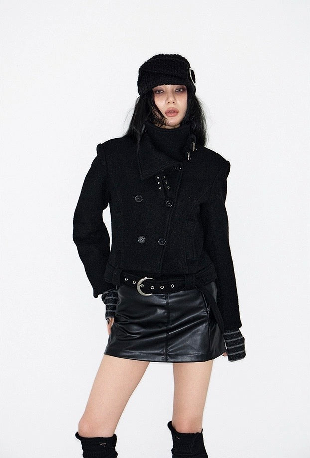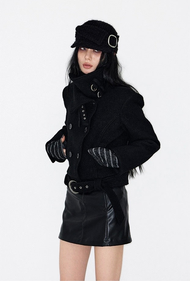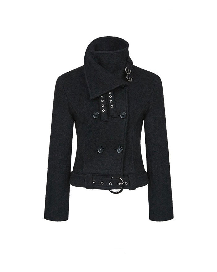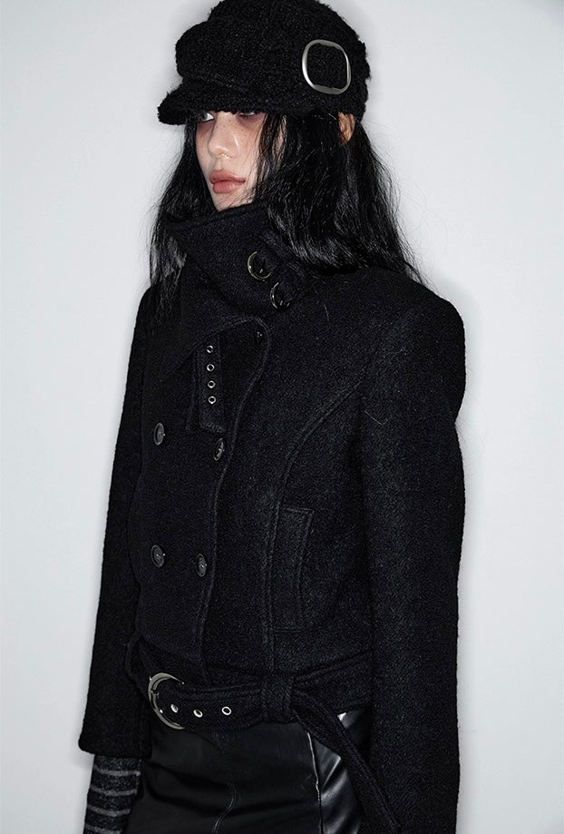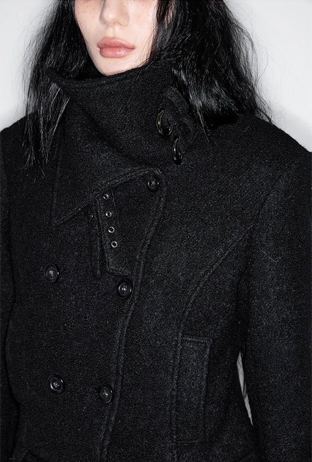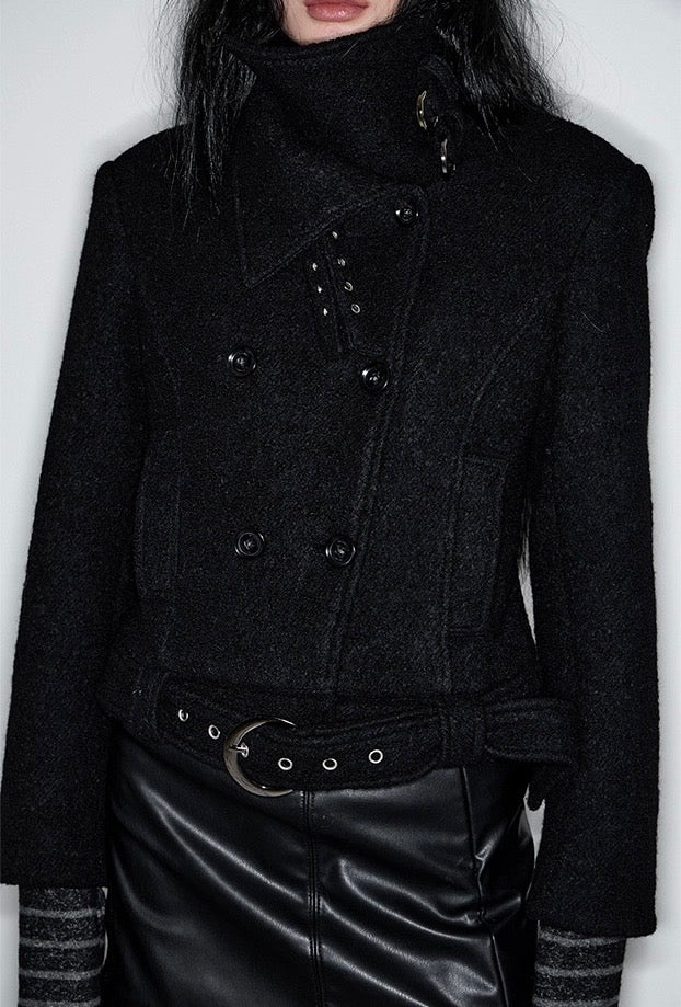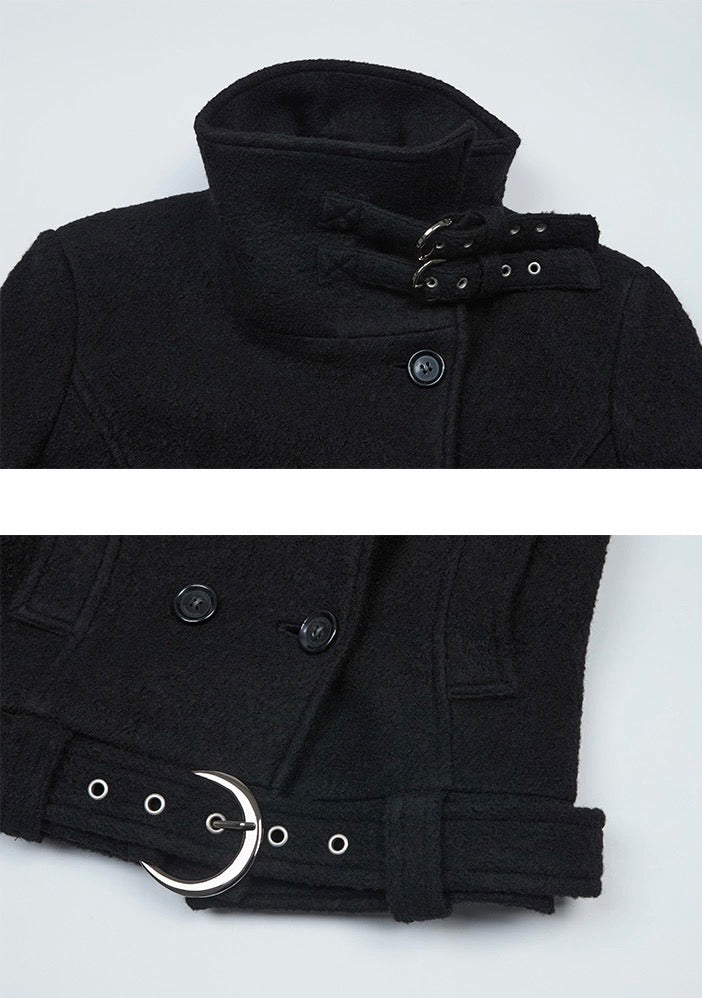 Double Belted High-Neck Coat - BLACK