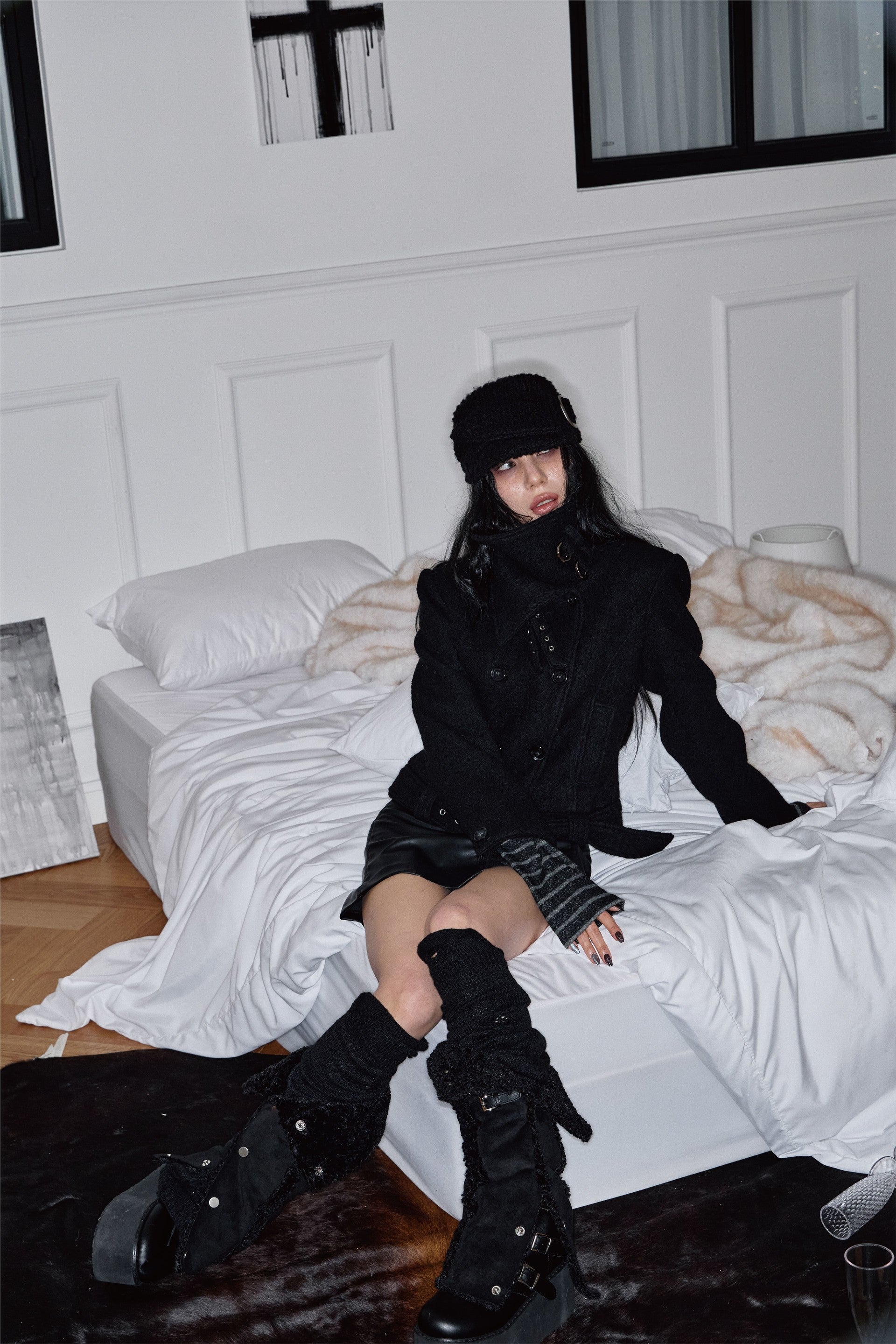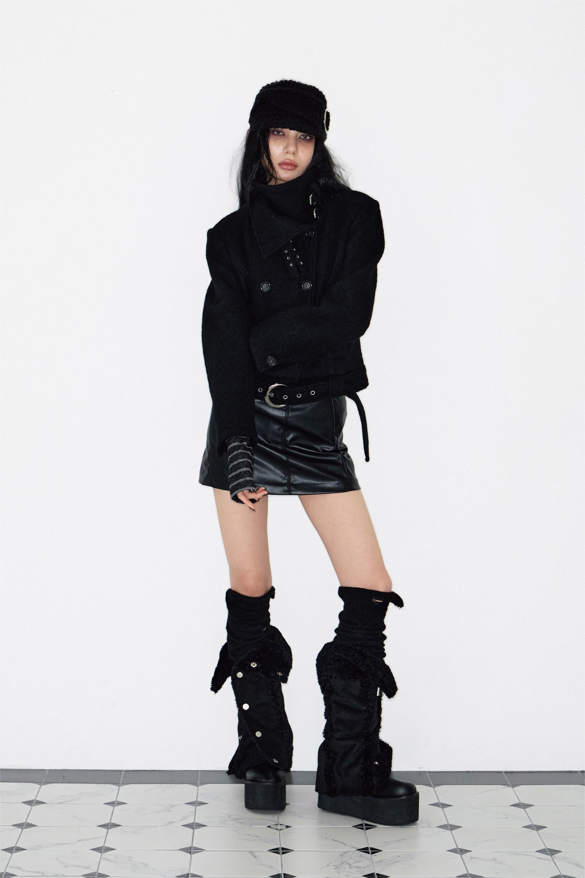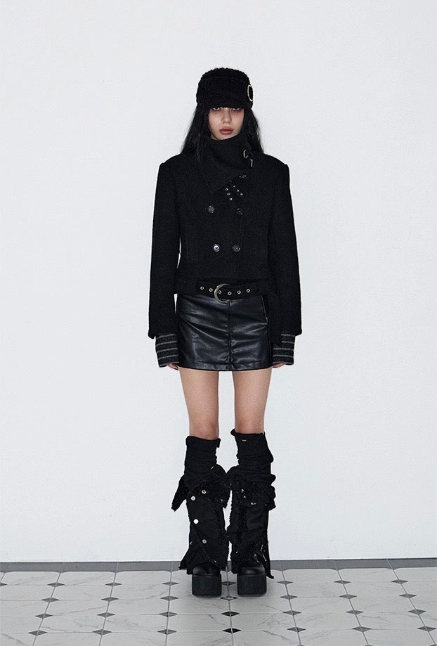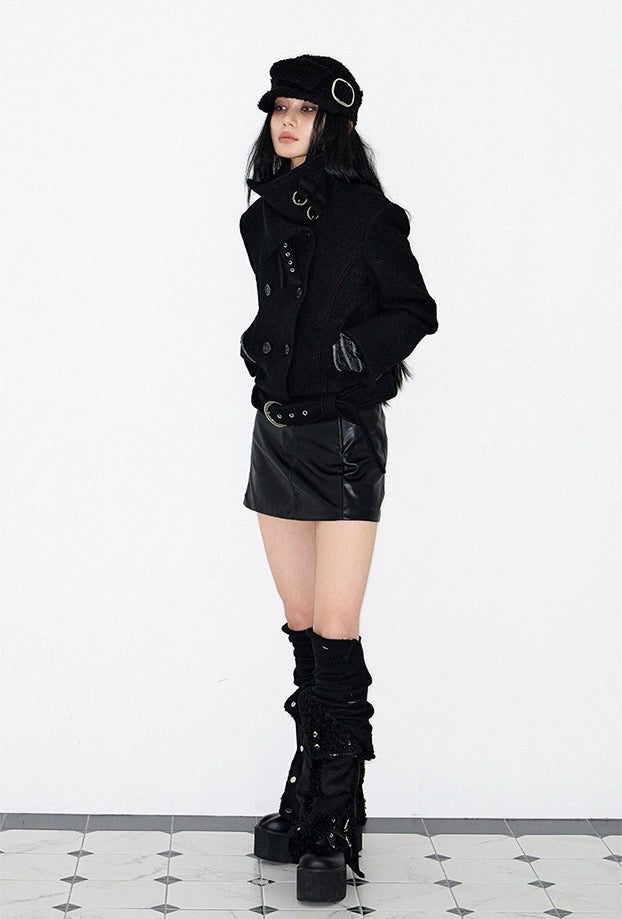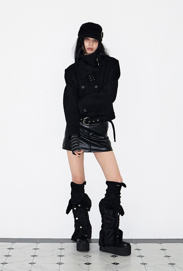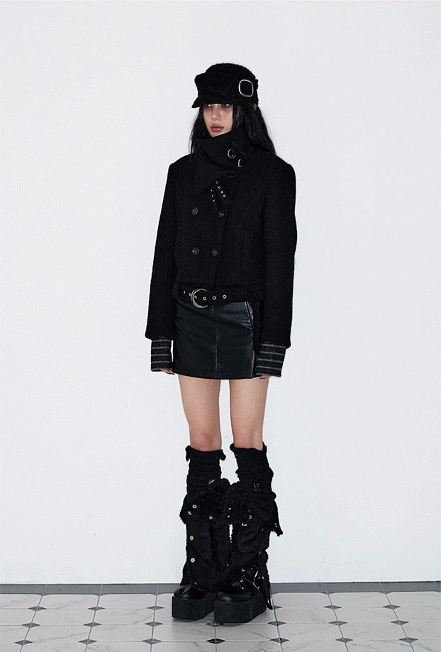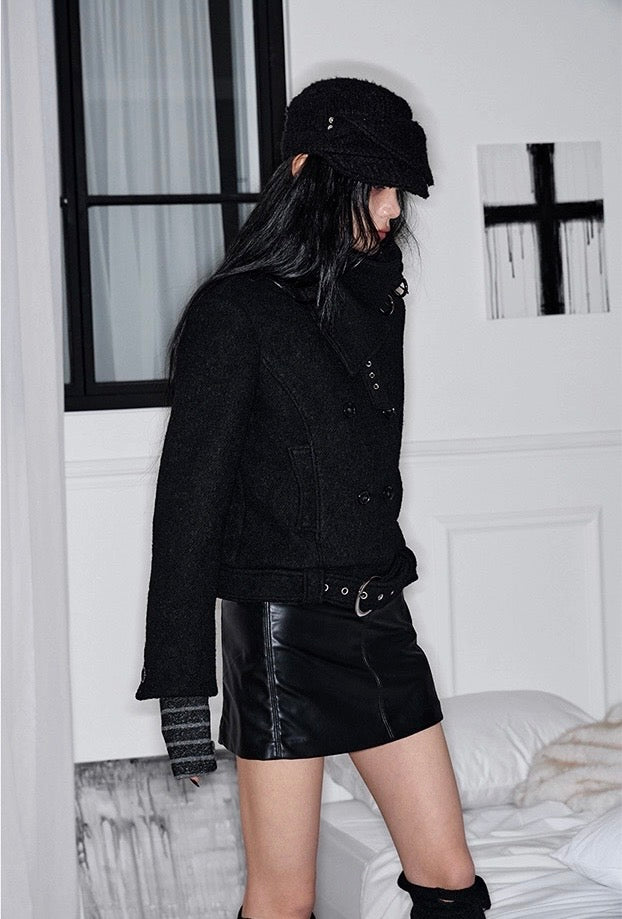 Double Belted High-Neck Coat - BLACK