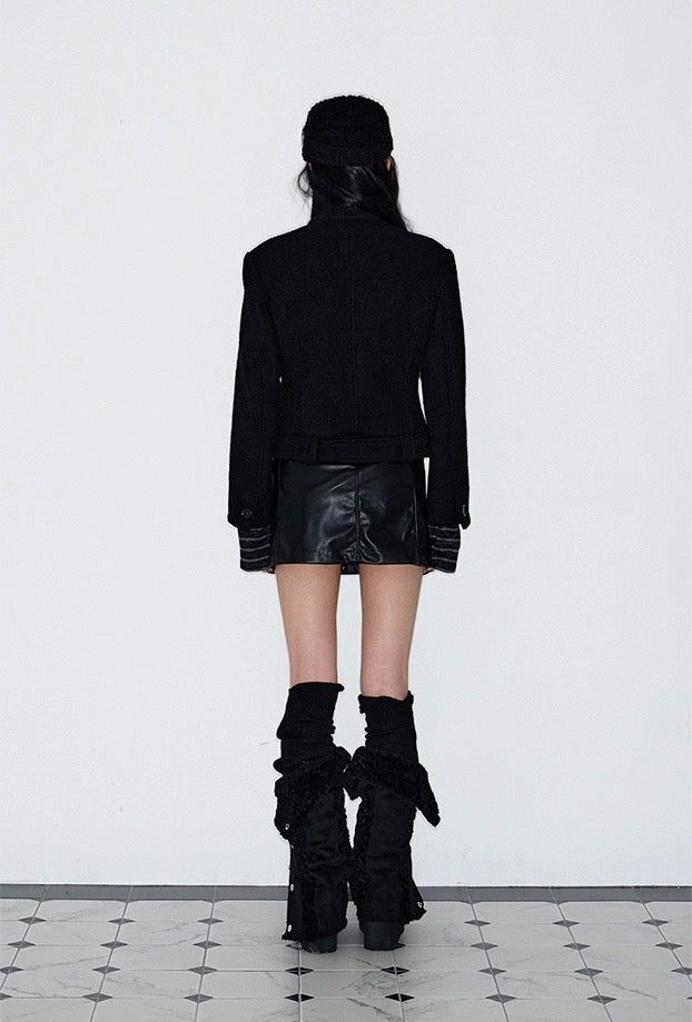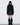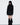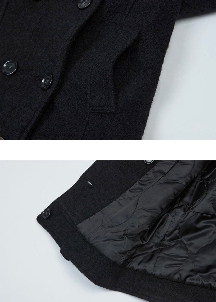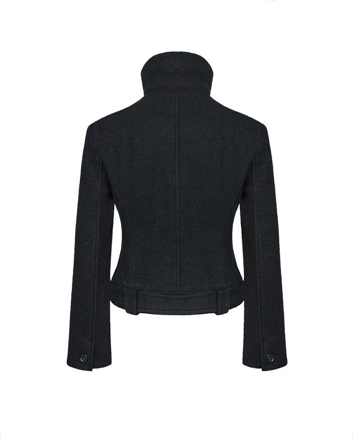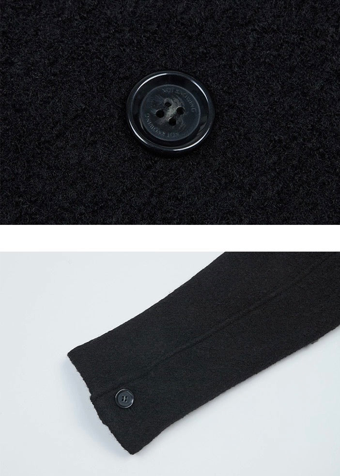 Mid-length black coat with a high neck, made of bouclé wool with a soft touch, offering a structured and elegant silhouette.