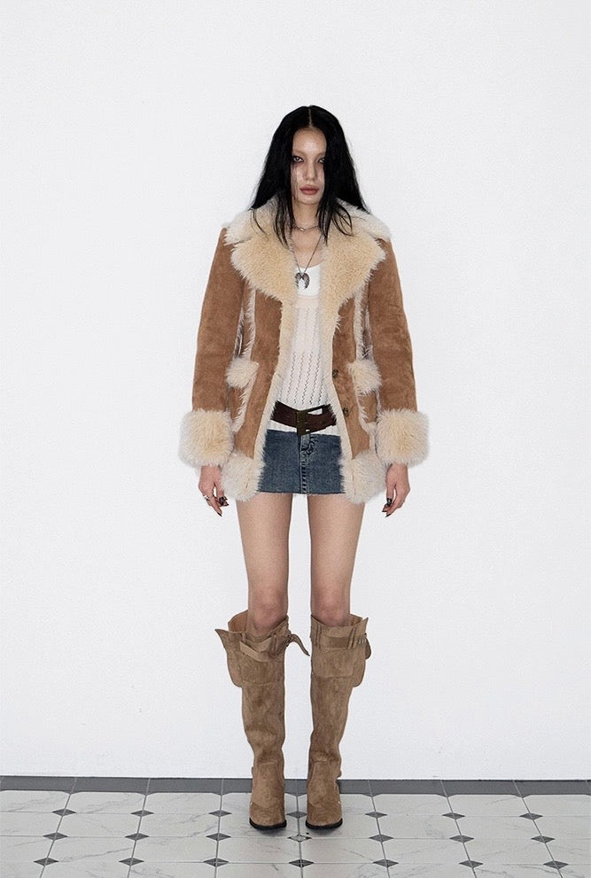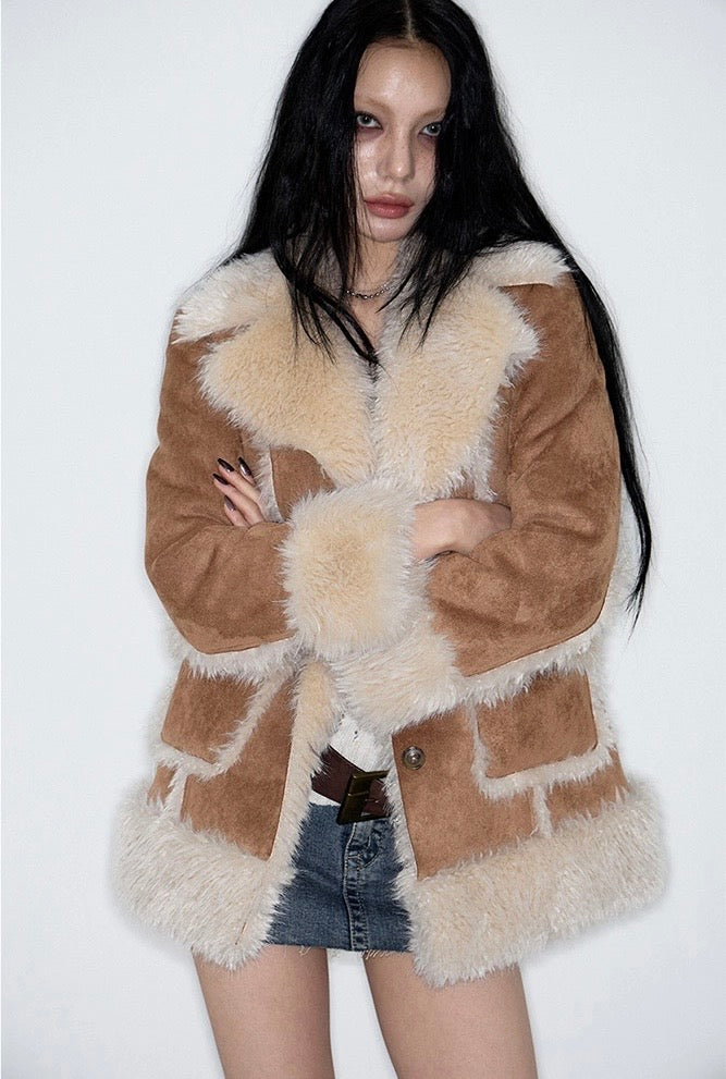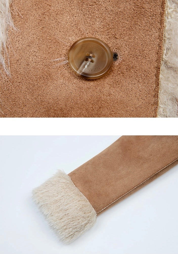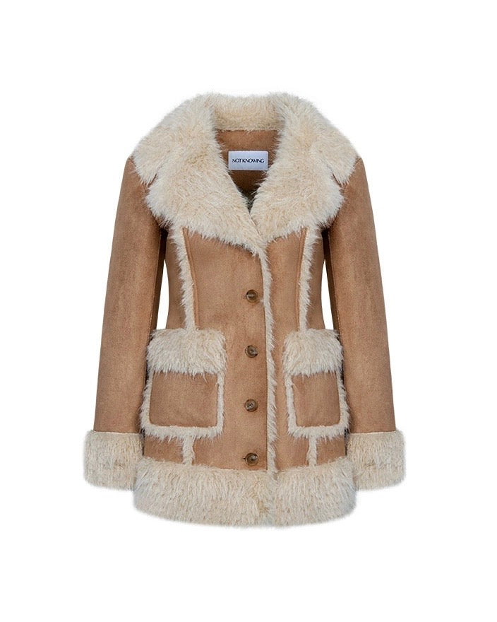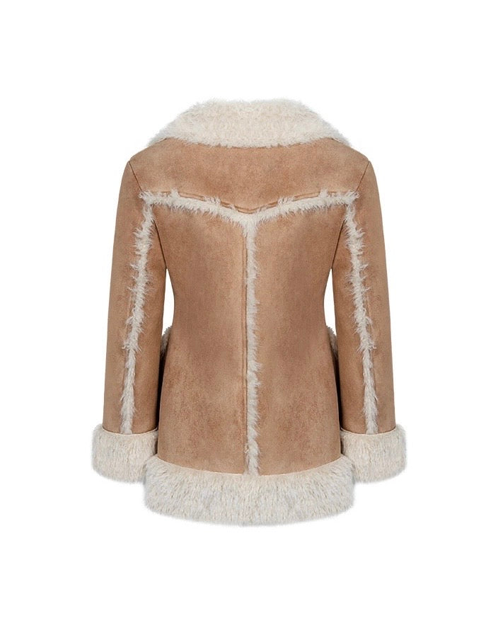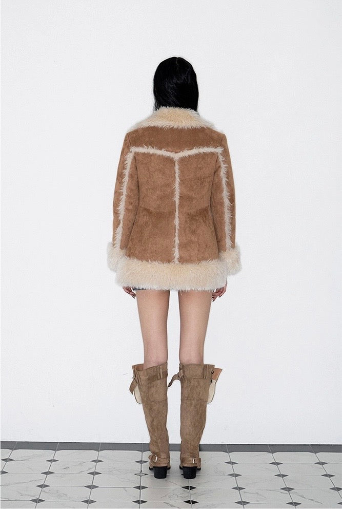 Mid-length coat in a faux shearling style, made of camel suede and beige faux fur with a very soft touch.