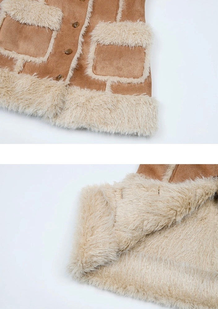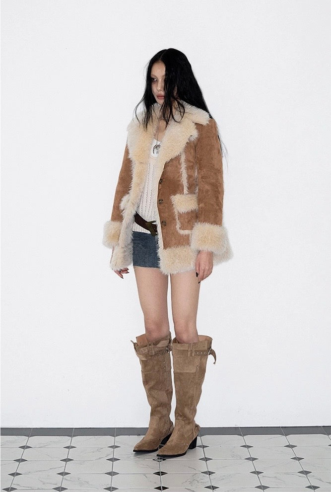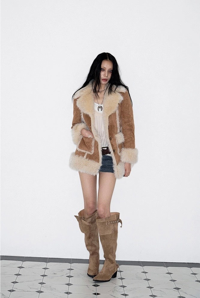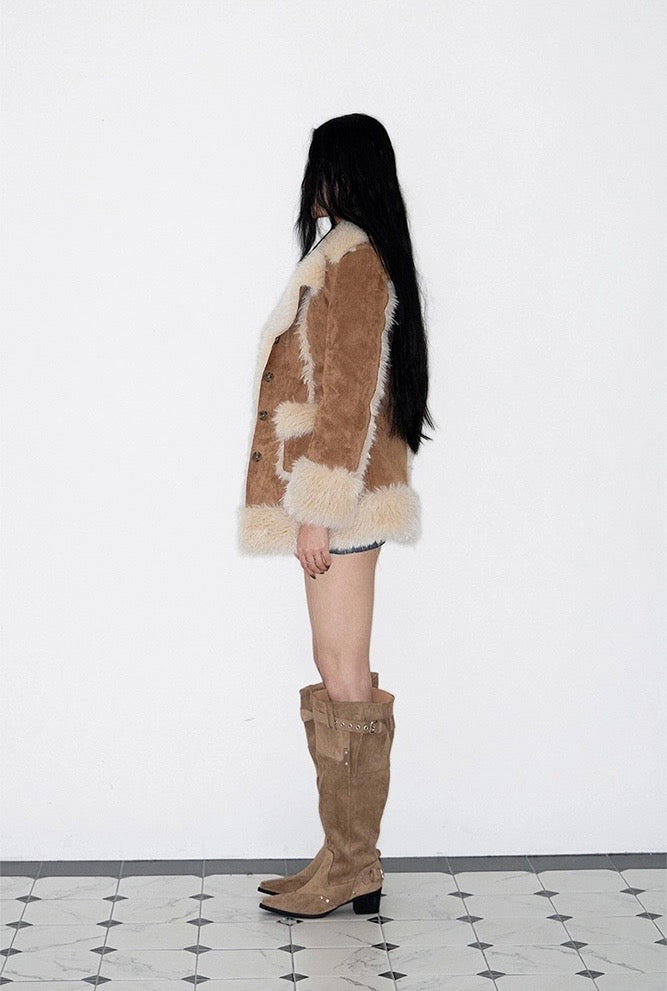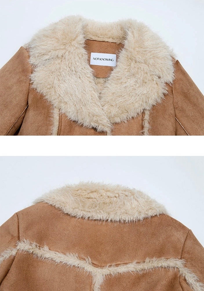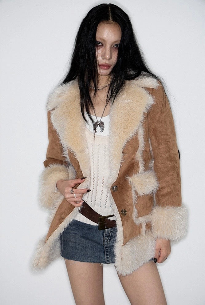 Mid-length coat in a faux shearling style, made of camel suede and beige faux fur with a very soft touch.